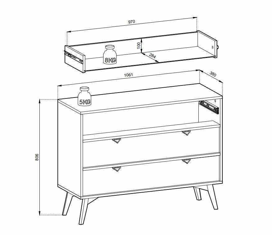 - Komoda na nožkách – opticky zvětšuje prostor a usnadňuje úklid