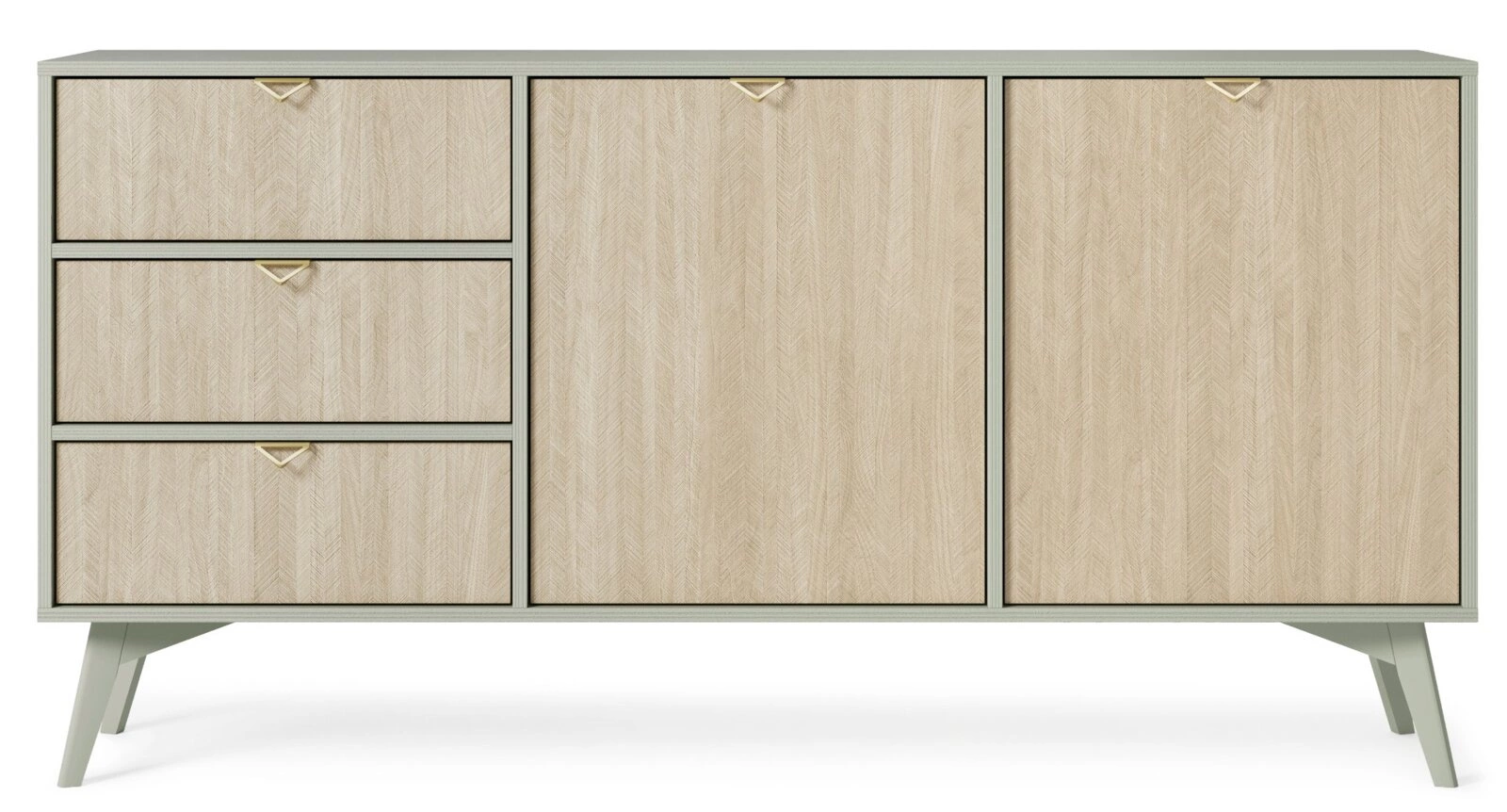 Přední část komody Sage upoutá pozornost jemným chevronovým vzorem, který dokonale ladí s matným povrchem a šalvějovým odstínem. Zlaté kovové úchytky dodávají celku luxusní nádech a zvýrazňují jedinečný glamour styl. Komoda stojí na čtyřech štíhlých nohách z přírodního bukového dřeva, díky čemuž působí lehce a zároveň stabilně. Tento model vynikne jak v elegantním obývacím pokoji, tak ve stylové ložnici, kde vytvoří působivé pozadí pro dekorace a doplňky.