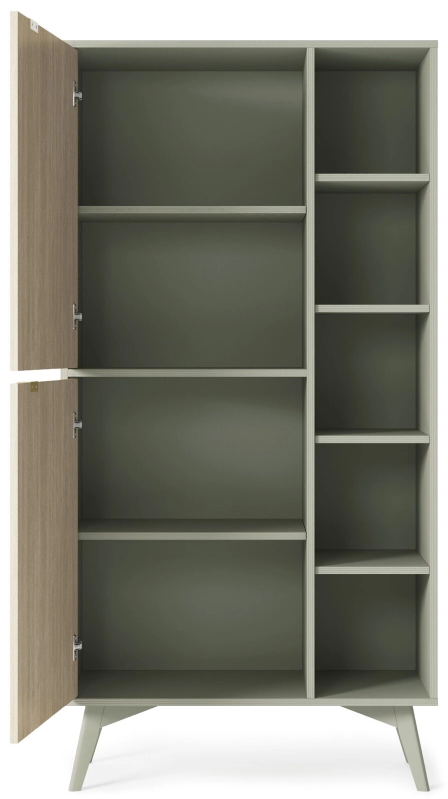 Knihovna Sage byla navržena pro milovníky jemné elegance a přírodních detailů. Dekorativní čela s motivem rybí kosti a zlaté kovové úchyty podtrhují jedinečný charakter nábytku a vytvářejí harmonii s trendy šalvějově zelenou a přirozeným odstínem dřeva. Tato kombinace barev přináší do interiéru svěžest a lehkost, zároveň však dodává prostoru sofistikovaný vzhled. Nejde jen o knihovnu do obýváku – stává se centrálním prvkem zařízení, který do místnosti vnáší styl boho glamour.