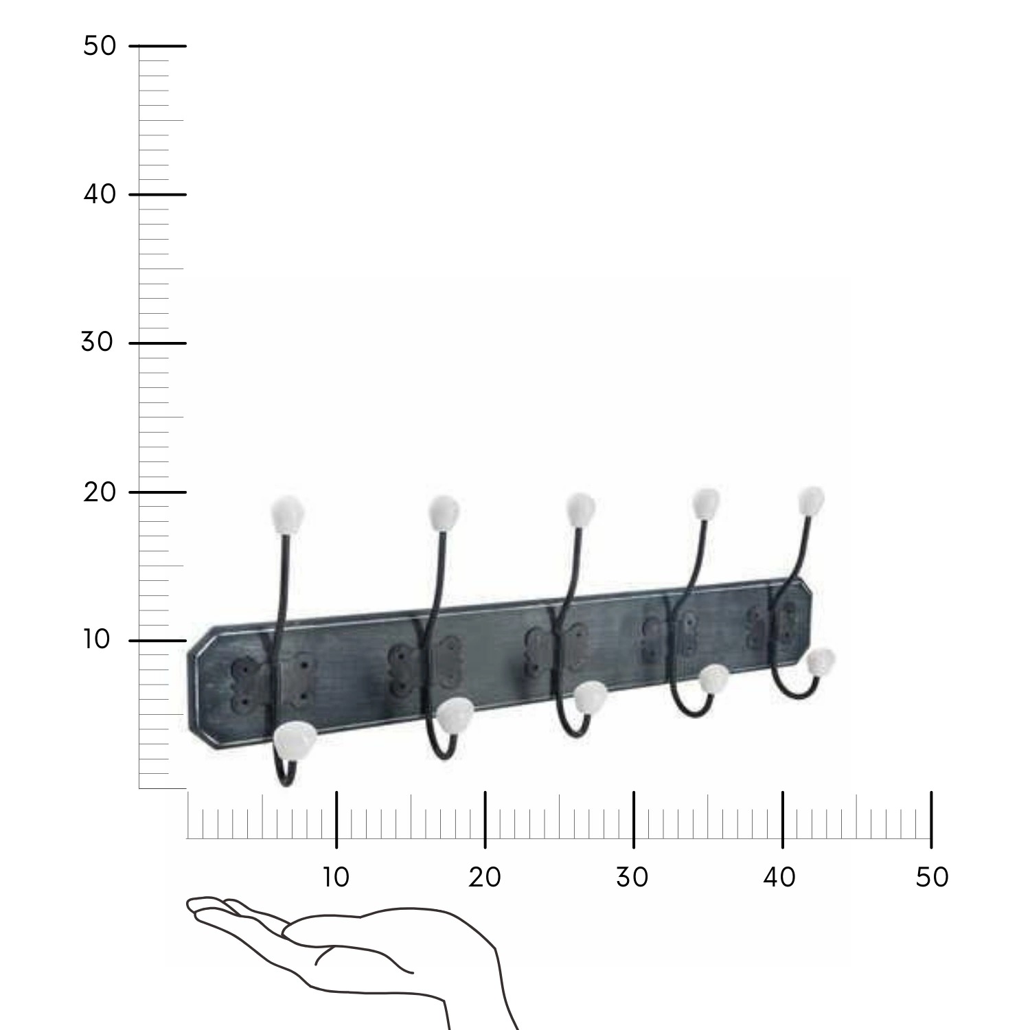 Nástěnný věšák Ruben byl navržen s ohledem na pohodlí každodenního užívání. Díky šířce 60,5 cm a pěti rozloženým háčkům snadno pojme celou kolekci svrchního oblečení pro členy domácnosti i hosty. Keramické úchyty chrání látky před zatrhnutím a zároveň přidávají elegantní dekorativní nádech. Věšák je lehký (váží pouze 0,75 kg), což usnadňuje montáž na stěnu bez zatížení konstrukce.