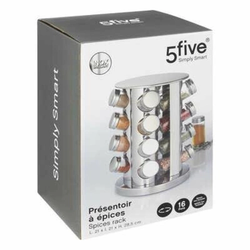 Otočný stojan na kořenky | 5five Simply Smart Udělejte si pořádek s otočným stojanem na kořenky od 5five Simply Smart. Má ocelovou konstrukci a 80ml skleněné dózy, které lze mýt v myčce. Představujeme vám dokonalý doplněk do vaší domácí kuchyně - ocelový stojan na koření! Inovativní doplněk pro skladování koření je vyroben z vysoce kvalitní oceli a skla a vnese do vaší kuchyně moderní, exkluzivní styl. Díky své nízké hmotnosti lze stojan snadno přenášet z jednoho místa na druhé, zatímco sklo a vzduchotěsné těsnění udrží vaše koření v bezpečí. Skleničky na koření pojmou až 80 ml vašich oblíbených bylinek a koření a poskytují dostatek prostoru pro organizaci a skladování. Skleněné dózy jsou navíc velmi odolné a snadno se udržují. Stačí je vložit do myčky, když se zašpiní, a máte vystaráno! Krásný stojan je dokonalým doplňkem každé kuchyně. Představuje klasický a stylový způsob ukládání vašeho oblíbeného koření a zároveň poutavý kousek bytové dekorace. Tak proč nedopřát své kuchyni nový stylový vzhled s ocelovým stojanem na kořenky! Na to je třeba pamatovat! Snadné ukládání a uspořádání bylinek a koření v 80ml sklenicích Stylový design zvýrazní přírodní dekor kuchyně Díky ekologickým materiálům je bezpečný pro pr.prostředí Skleněné nádoby lze mýt v myčce nádobí, takže čištění je snadné a bezproblémové