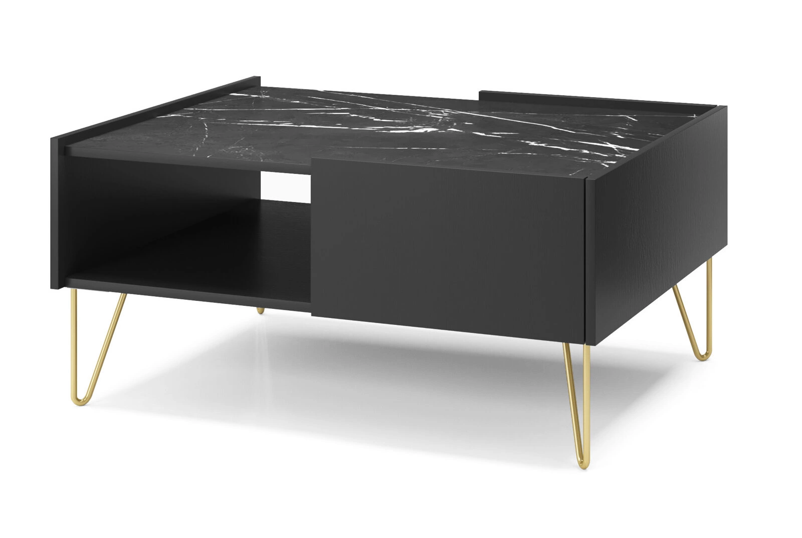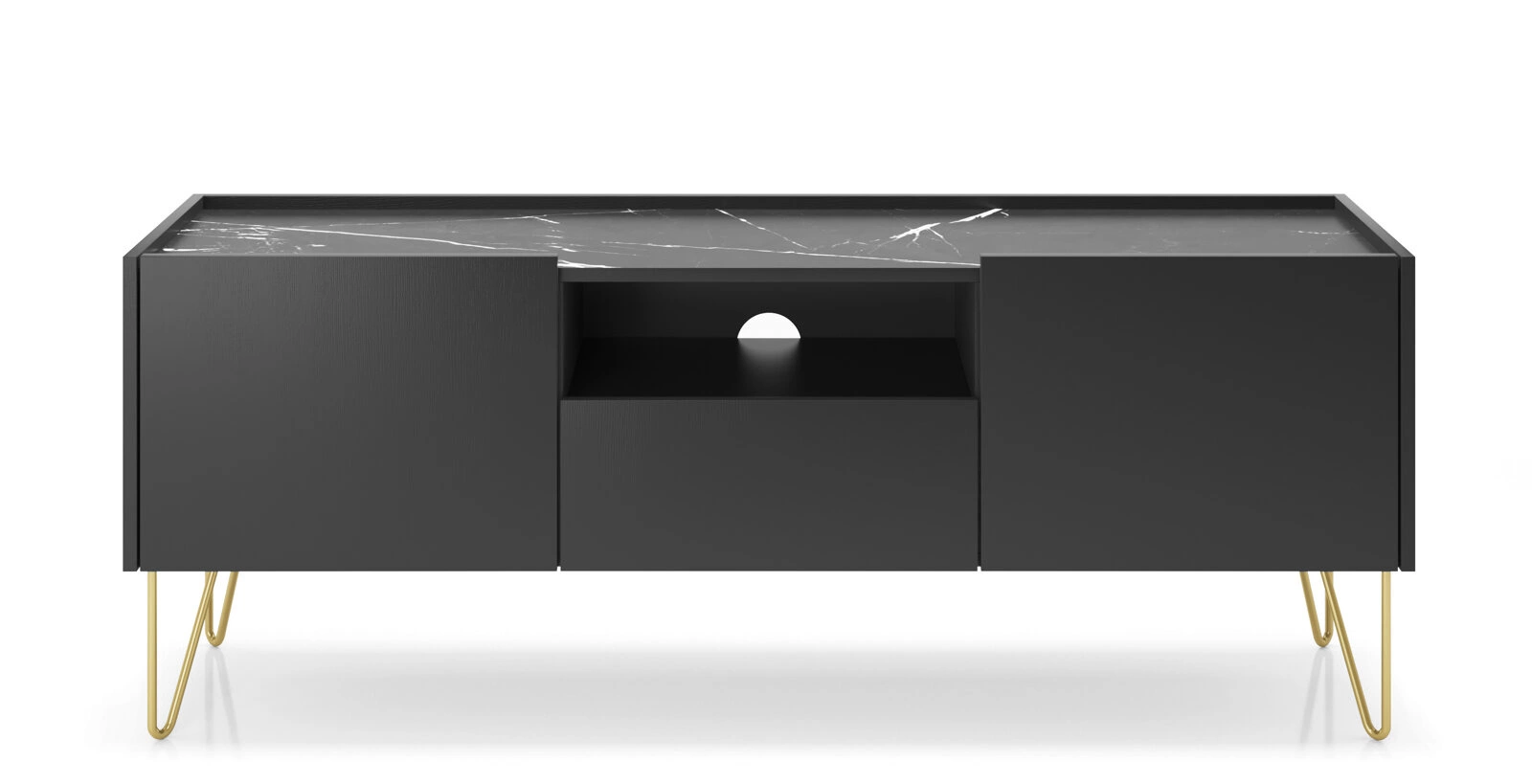Černá komoda s horní deskou v imitaci černého mramoru usazená na vysokých kovových nožkách ve zlaté barvě dodá vašemu prostoru jedinečnou atmosféru. Komoda ve stylu glamour se bude hodit do moderního a trendy interiéru obývacího pokoje nebo pracovny.