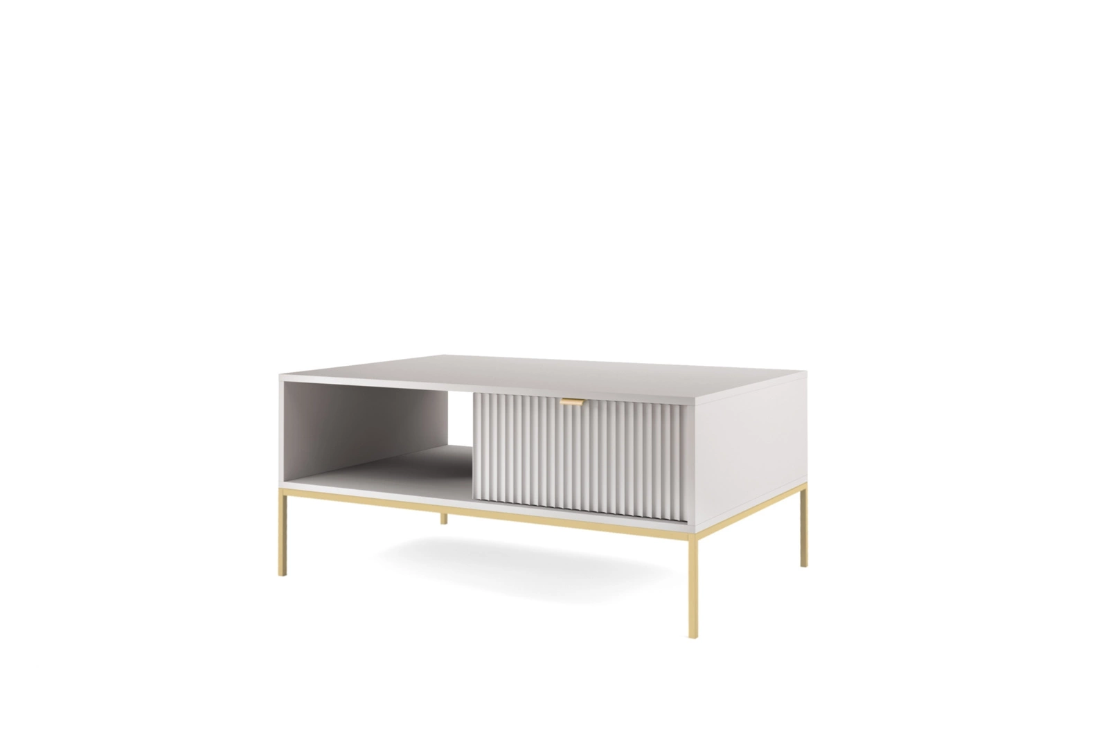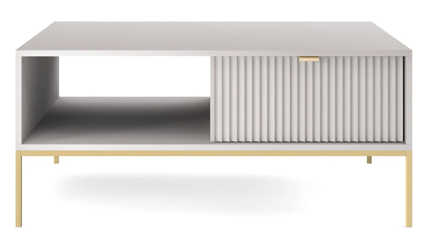 Doskonałym uzupełnieniem zestawu mebli do salonu jest również stolik kawowy z szufladą i ryflowanym frontem. Jego nowoczesny design łączy się z funkcją, co czyni go niezbędnym elementem każdego salonu. Przestronna szuflada umożliwia przechowywanie przeróżnych przedmiotów, zapewniając porządek i łatwy dostęp do wszystkiego, czego możemy potrzebować podczas relaksu w salonie. Front z płyty meblowej z ryflowaniem nadaje stolikowi unikalnej estetyki, a solidne nogi gwarantują stabilność i trwałość. Bez względu na to, czy szukasz stolika do serwowania porannej kawy, czy miejsca na ulubione książki, ten mebel z pewnością spełni Twoje oczekiwania.