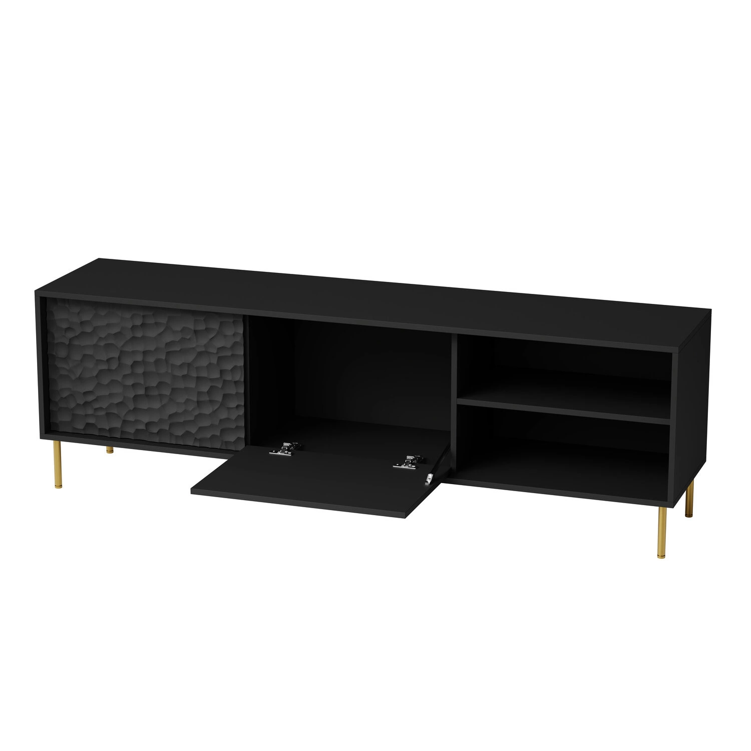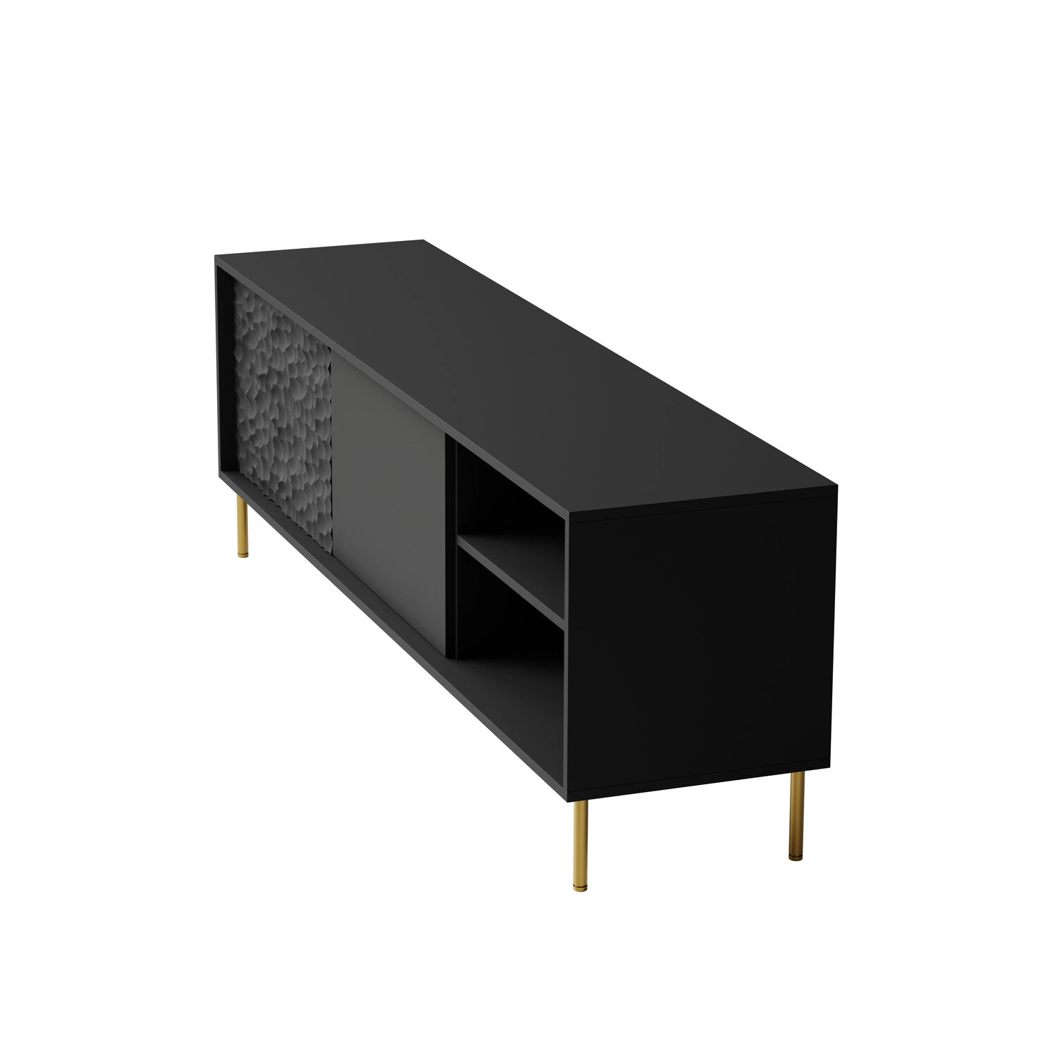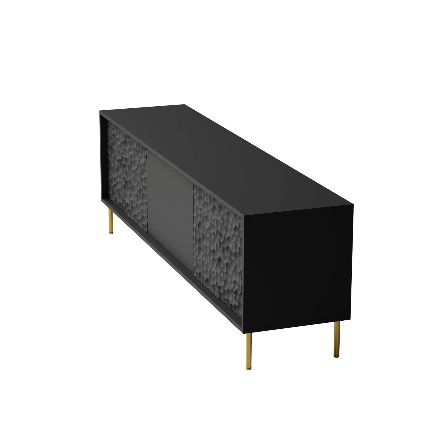 Mebel ma imponujące wymiary 180/41/58 cm i został wykonany z wysokiej jakości materiałów. Blat szafki wykonany jest z laminowanego MDF-u, który gwarantuje trwałość i łatwość w utrzymaniu czystości. Natomiast nóżki wykonane są z polipropylenu, a ich złoty kolor dodaje szafce elegancji i prestiżu. Kolekcja Afir charakteryzuje się wyrafinowanym stylem i starannym wykonaniem. Meble z tej kolekcji wykonane są z czarnej płyty MDF, a ich fronty ozdobione są dekorem 3D w formie wgłębień, nadając im unikalny wygląd. Całość prezentuje się bardzo elegancko i luksusowo, będąc doskonałym elementem dekoracyjnym w różnych stylach wnętrzarskich, od nowoczesnych po klasyczne. Szafka to niezwykle praktyczne rozwiązanie do przechowywania, które oferuje zarówno otwarte półki, jak i zamykane szafki. Dzięki temu, możesz wygodnie i estetycznie przechowywać swoje urządzenia RTV, a jednocześnie ukryć drobne przedmioty, które nie muszą być na widoku.