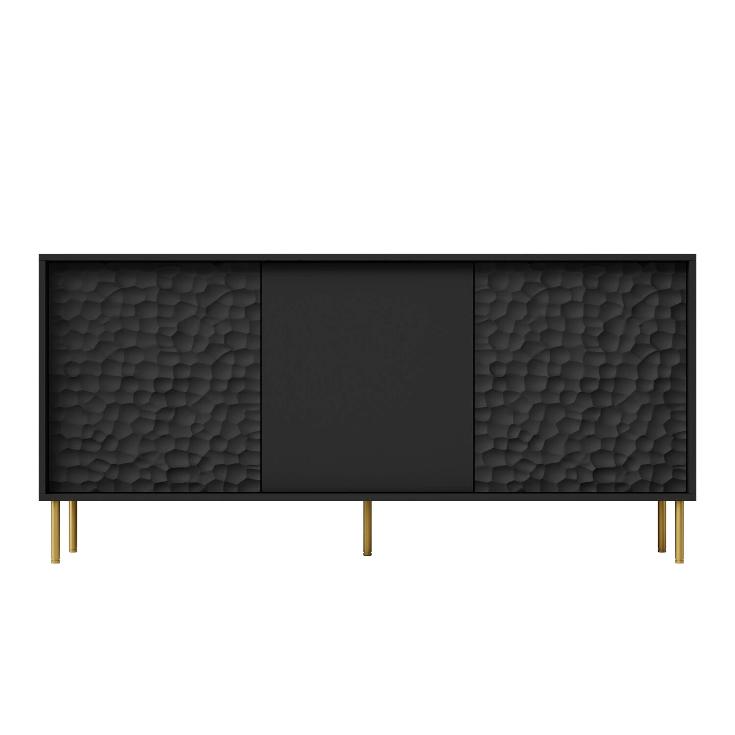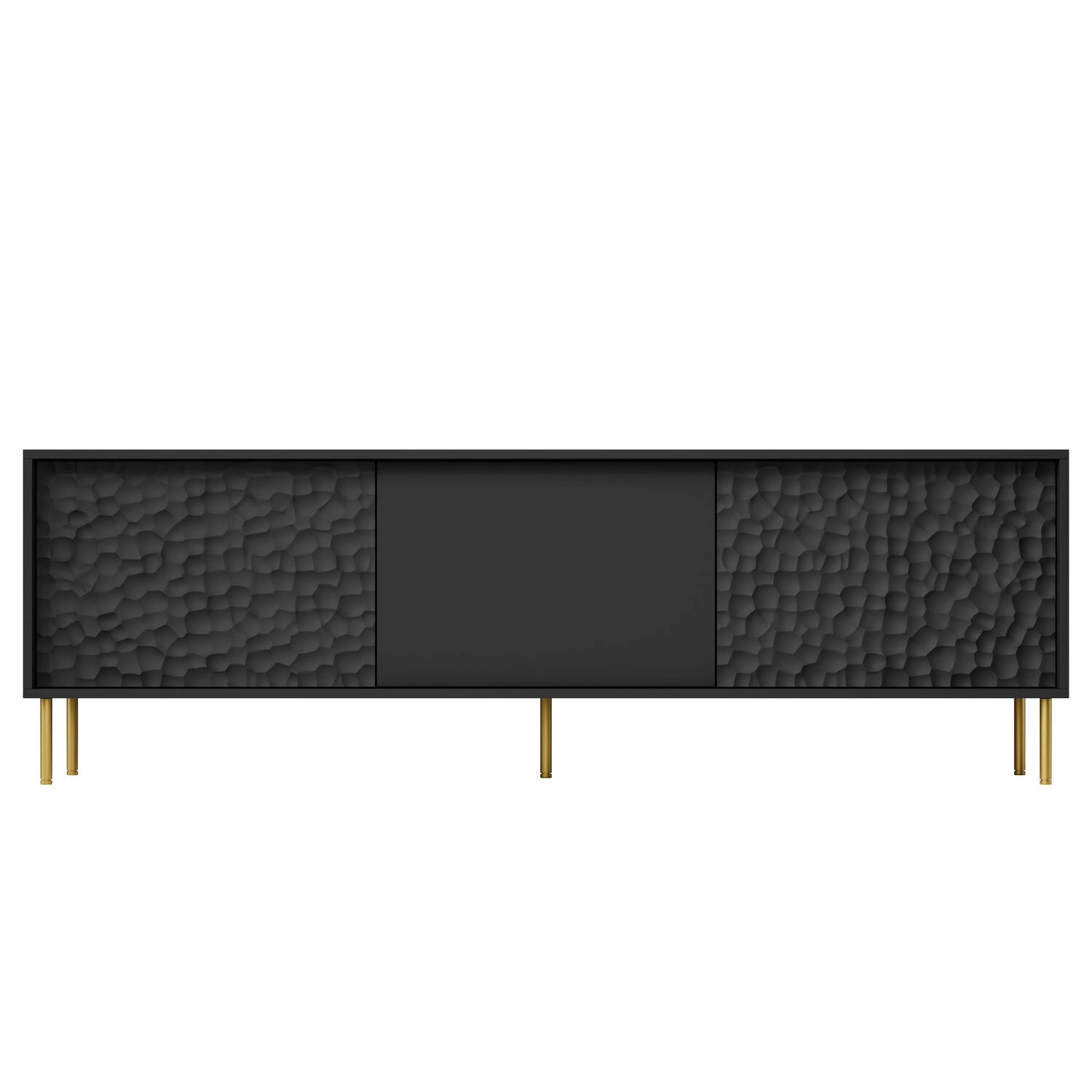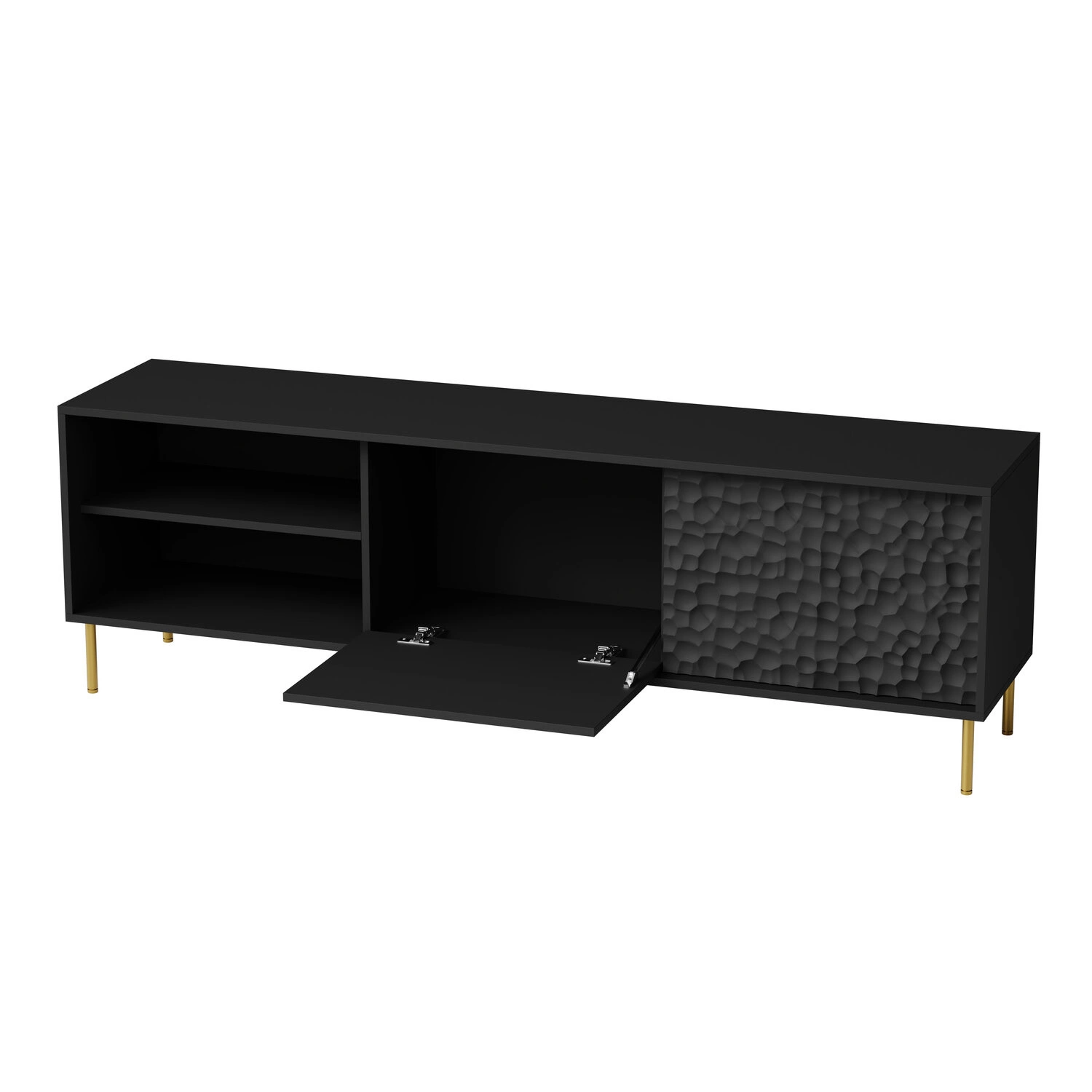 Mebel ma imponujące wymiary 180/41/58 cm i został wykonany z wysokiej jakości materiałów. Blat szafki wykonany jest z laminowanego MDF-u, który gwarantuje trwałość i łatwość w utrzymaniu czystości. Natomiast nóżki wykonane są z polipropylenu, a ich złoty kolor dodaje szafce elegancji i prestiżu. Kolekcja Afir charakteryzuje się wyrafinowanym stylem i starannym wykonaniem. Meble z tej kolekcji wykonane są z czarnej płyty MDF, a ich fronty ozdobione są dekorem 3D w formie wgłębień, nadając im unikalny wygląd. Całość prezentuje się bardzo elegancko i luksusowo, będąc doskonałym elementem dekoracyjnym w różnych stylach wnętrzarskich, od nowoczesnych po klasyczne. Szafka to niezwykle praktyczne rozwiązanie do przechowywania, które oferuje zarówno otwarte półki, jak i zamykane szafki. Dzięki temu, możesz wygodnie i estetycznie przechowywać swoje urządzenia RTV, a jednocześnie ukryć drobne przedmioty, które nie muszą być na widoku.