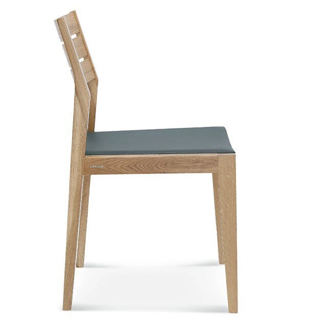 Pevná konstrukce z masivního bukového dřeva, lakovaná povrchová úprava a čalouněný sedák o výšce 47 cm dělají tuto židli pohodlnou a mimořádně odolnou pro každodenní použití. Vybrané potahové látky jsou nejen estetické, ale i snadno udržovatelné, takže židle je skvělou volbou do rodinné jídelny i gastronomických provozů. Opěradlo s příčnými lamelami poskytuje stabilní oporu zad, a absence područek umožňuje židli snadno zasunout pod stůl.