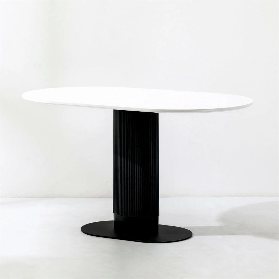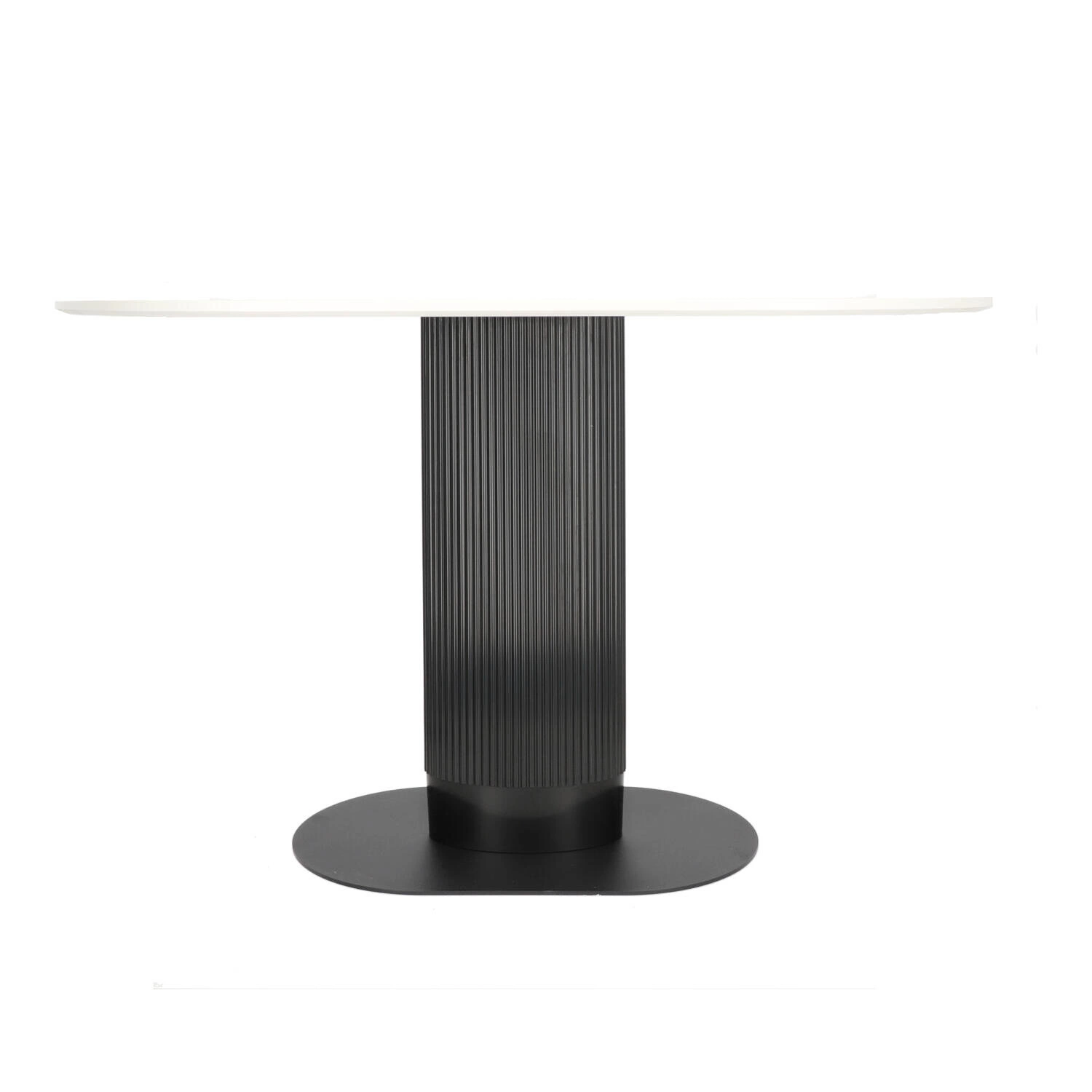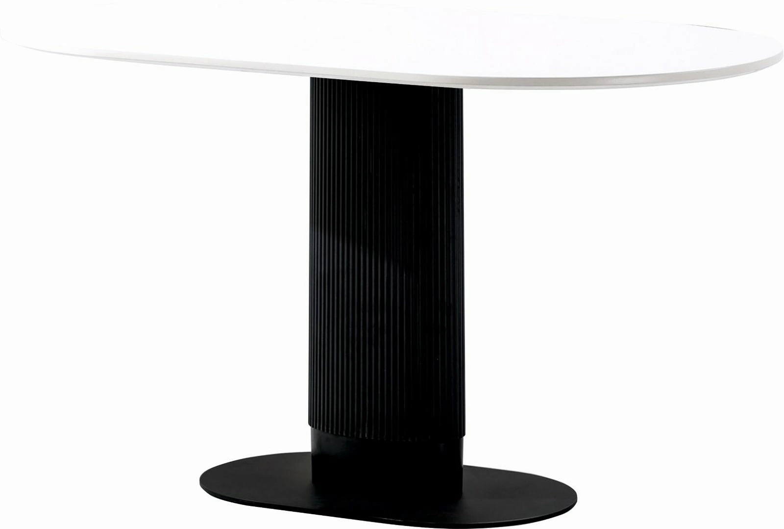 Jídelní stůl Maxim od značky Intesi je ztělesněním moderního designu – oválná bílá deska o rozměrech 120x70 cm, podepřená výraznou černou nohou, tvoří harmonické spojení funkčnosti a originální estetiky. Stůl Maxim je vyroben z odolné, laminované MDF desky a stabilní ocelové základny s práškovým nástřikem, díky čemuž je nejen odolný vůči každodennímu používání, ale také snadno udržovatelný v čistotě. Díky univerzálnímu charakteru skvěle zapadne do jídelny, obývacího pokoje, kuchyně nebo i menší kavárny.