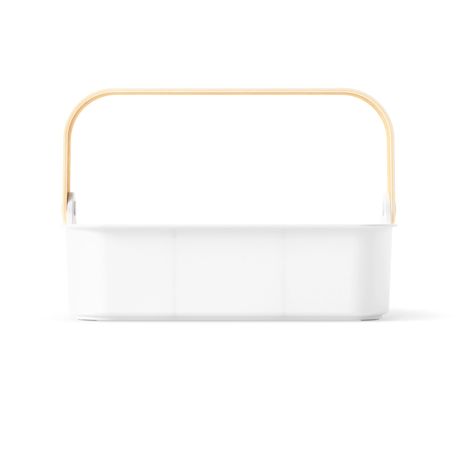 Minimalistický tvar a kombinace bílé barvy s dřevem dávají organizeru Bellwood Umbra moderní, severský charakter. Obdélníkový tvar perfektně zapadne jak do koupelny v boho stylu, tak i do klasických nebo industriálních interiérů. Dřevěné úchyty nejen dodávají šmrnc, ale také usnadňují přenášení boxu – můžete pohodlně měnit jeho umístění podle aktuální potřeby.