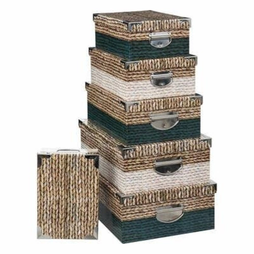 Sada 6 dekoračních kartonových krabic 5five simply smart je praktickým a stylovým řešením pro ukládání věcí, které skvěle zapadne do moderního interiéru. Krabice jsou vyrobeny z pevného kartonu a doplněny kovovými prvky – v přírodních a zelených odstínech vám usnadní organizaci prostoru doma, v kanceláři nebo v dětském pokoji. Díky různým rozměrům – od 28 x 19,5 x 10,8 cm až po 48 x 33,5 x 16 cm – bez problémů uložíte jak drobnosti, tak větší předměty.