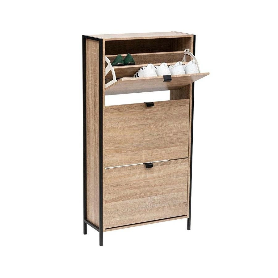 Botník Aliaj 3-dveřový od značky 5five simply smart je vysoký, loftový stojící nábytek určený do předsíně. Je vyrobený z odolné nábytkové desky v dekoru přírodního dřeva v kombinaci s černým kovem. Nabízí tři samostatné přihrádky uzavíratelné čelními dvířky s hladkým polomatným povrchem, což umožňuje efektivně uspořádat a schovat obuv celé domácnosti. Díky výšce 122 cm a šířce 63 cm se botník skvěle hodí i do úzkých prostor, a jeho výrazný industriální design dokonale podtrhne moderní styl vašeho interiéru.