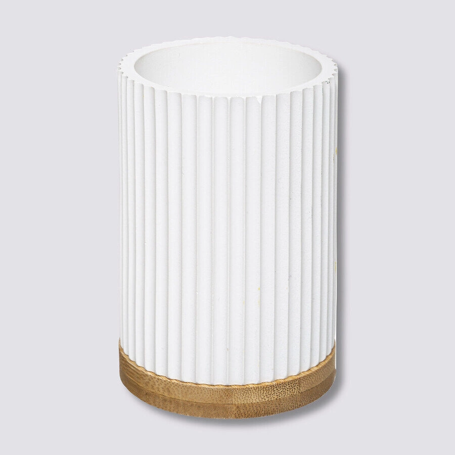 Pokud si potrpíte na funkčnost a styl, tento kelímek na zubní kartáčky bude praktickým a elegantním doplňkem vaší koupelny. Kontrast bílého pryskyřičného povrchu a přírodního bambusového dřeva vnáší svěžest i decentní ekologický nádech do interiéru. Díky univerzální barevnosti jej snadno sladíte s dalšími koupelnovými doplňky a kulatý tvar zajišťuje stabilitu na každém povrchu.