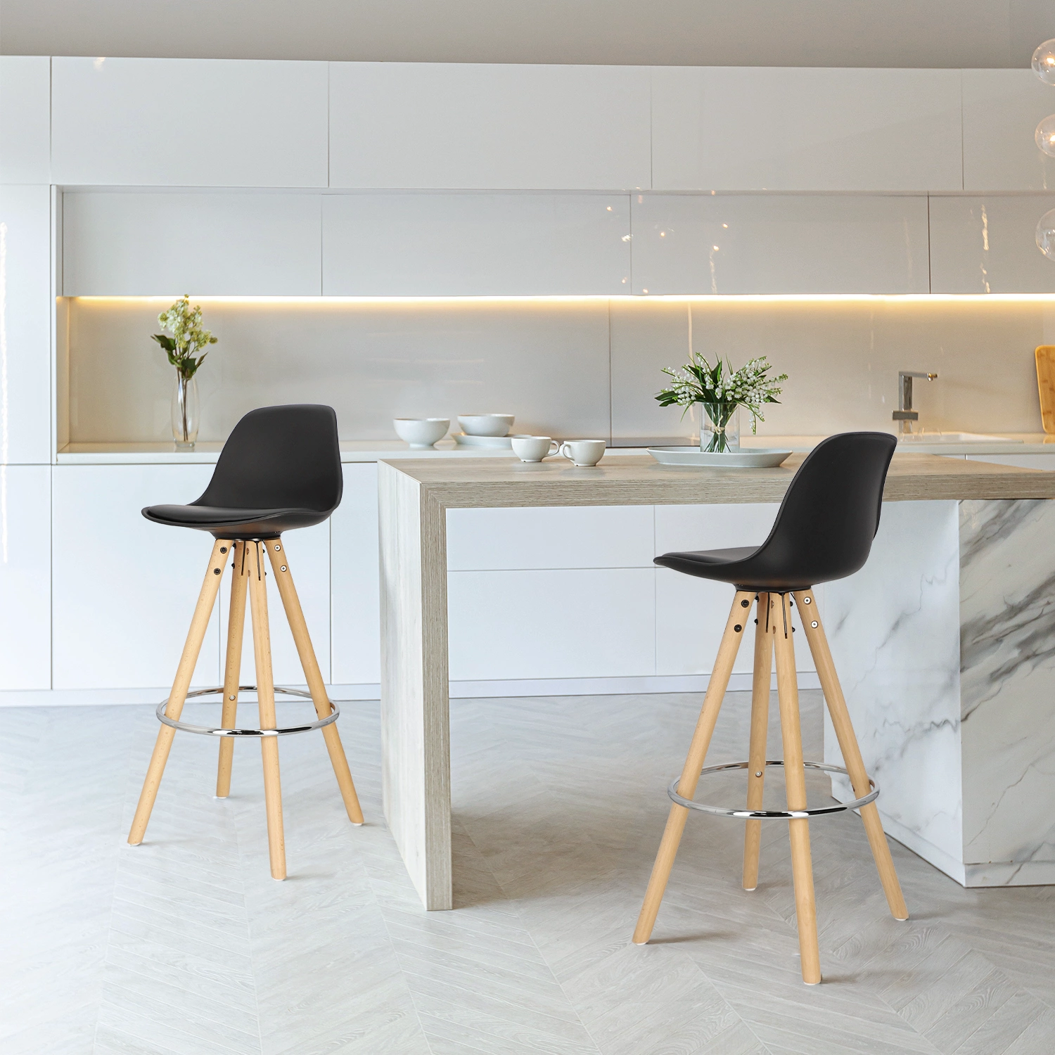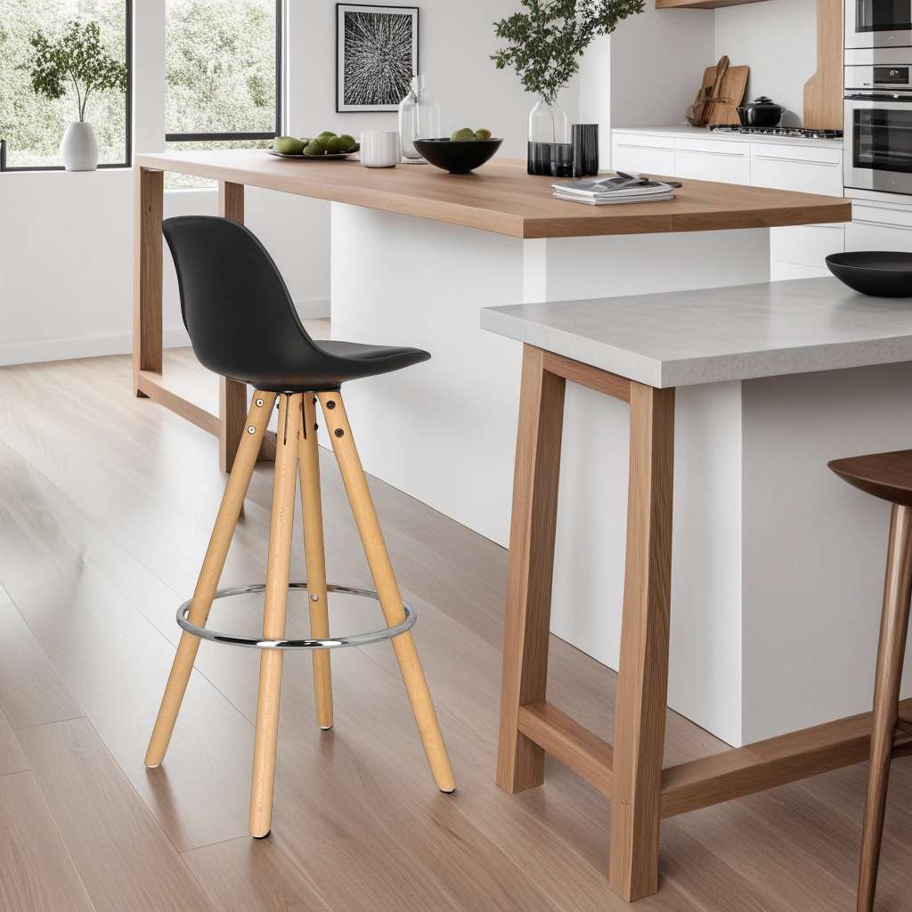 Hoker Nord černý s opěradlem je navržen s ohledem na každodenní využití. Absence područek umožňuje snadné zasunutí židle pod pracovní desku, zatímco vysoké nohy usnadňují úklid robotickým vysavačem. Díky nízké hmotnosti (5 kg) lze barovou židli snadno přesunout a montáž je rychlá a jednoduchá.