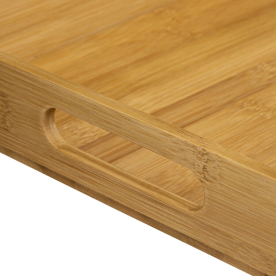 Sada 2 obdélníkových bambusových táců 5five simply smart je praktickým a stylovým doplňkem, který se skvěle hodí jak k servírování nápojů a ovoce, tak i jako dekorativní tác na jídelní nebo kuchyňský stůl. Vyrobeny z odolného bambusového dřeva zaujmou přirozenou barvou a jednoduchým, nadčasovým designem. V sadě najdete dva tácy o rozměrech 38×26×4 cm a 46,5×30,5×5 cm, každý vybavený pohodlnými dřevěnými úchyty pro snadné přenášení.