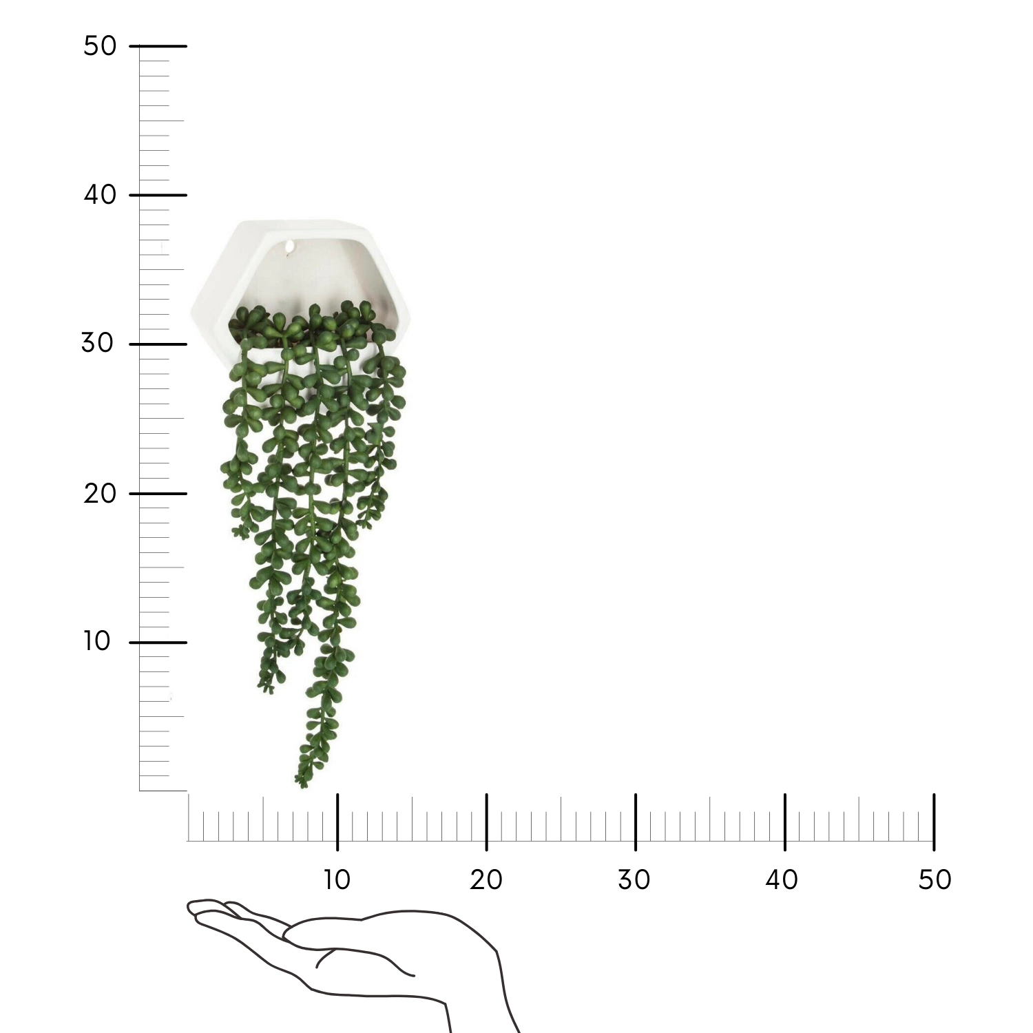 Díky možnosti zavěšení na stěnu umělá vinná réva snadno oživí fádní plochy a vdechne interiéru kousek přírody. Kompaktní rozměry (výška 45 cm, šířka květináče 14 cm) umožňují umístit ji samostatně nebo v kombinaci s dalšími nástěnnými dekoracemi. Jedinečné spojení zelené rostliny a surového cementu podtrhuje charakter moderních, minimalistických a industriálních interiérů.