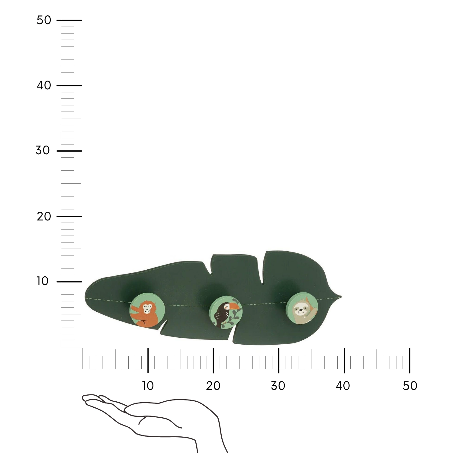 Nástěnný věšák ve tvaru listu je ideální volbou pro zavěšení bund, mikin, sáčku na přezůvky i dětského batůžku. Pohodlné háčky jsou tvarované tak, aby z nich věci nesklouzávaly během používání. Hladký povrch umožňuje snadné otírání a udržení čistoty, což je v dětském pokoji velmi důležité. Dekorativní list s džunglovým motivem podtrhne přírodní nebo tématicky laděný interiér a inspiruje děti ke hře i kreativitě.