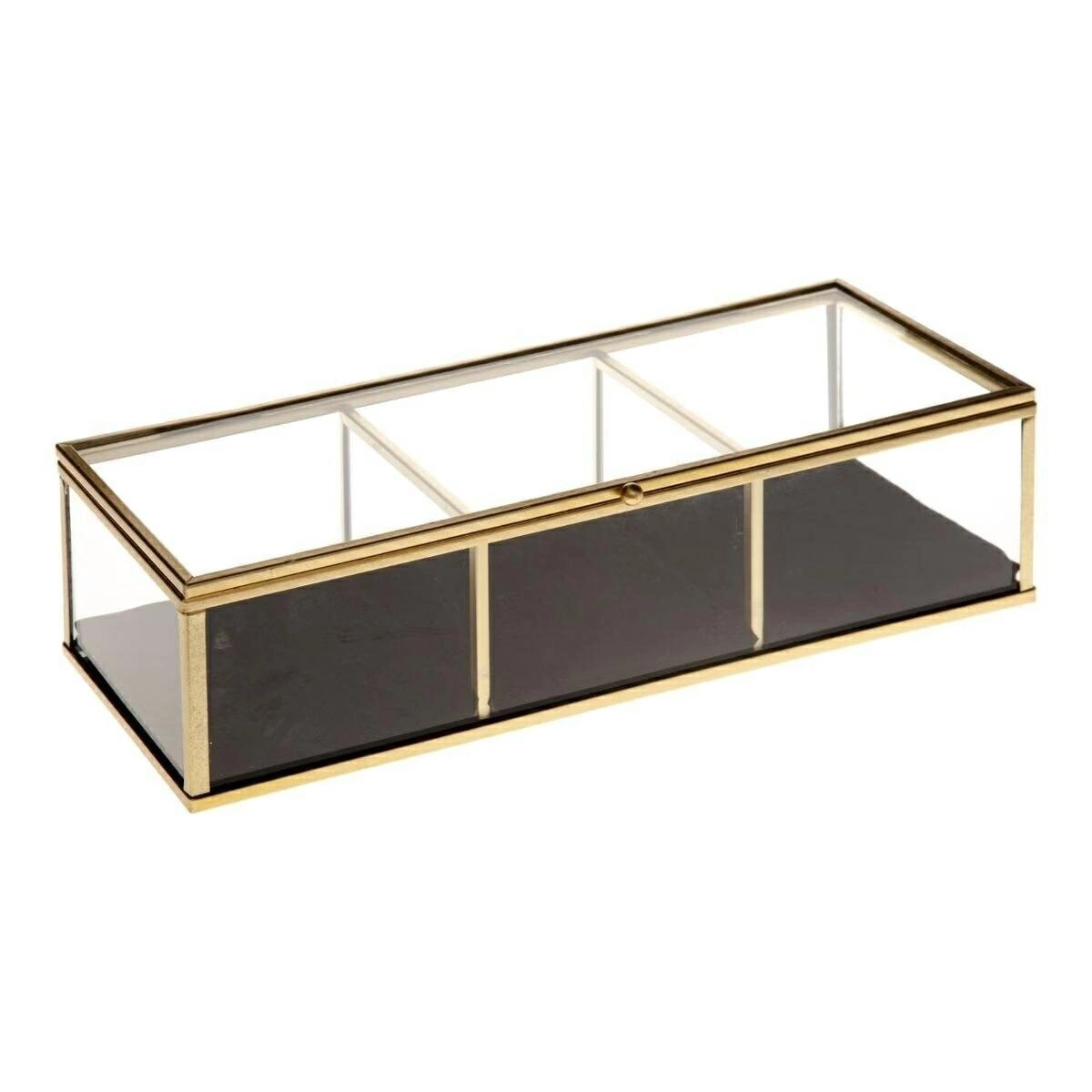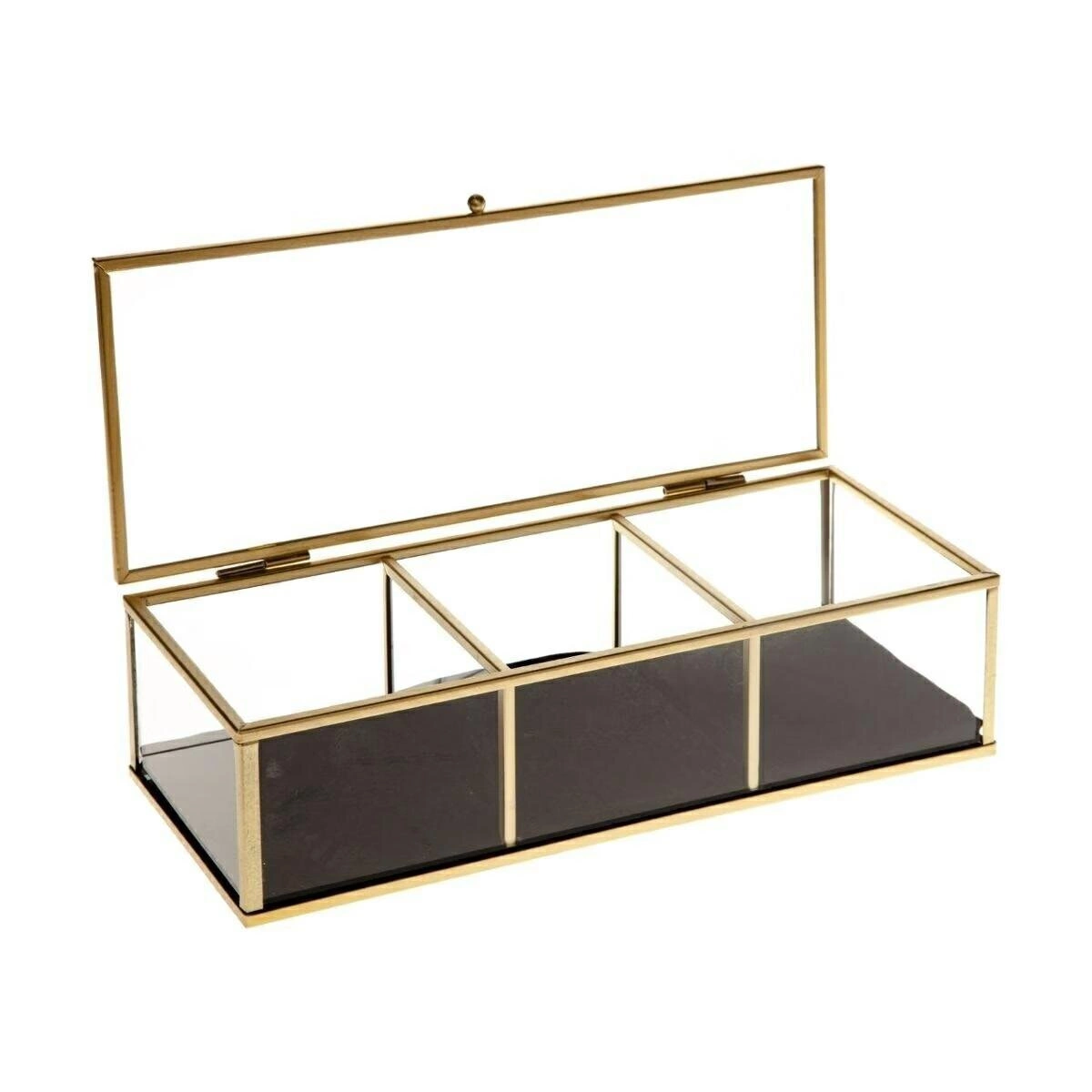 Skleněná šperkovnice Victoria poskytuje nejen praktické místo pro uložení drobností a šperků, ale také elegantní dekorativní prvek. Design je založen na kombinaci starozlatého kovového rámu a skleněných stran, což mu dodává jedinečný půvab.