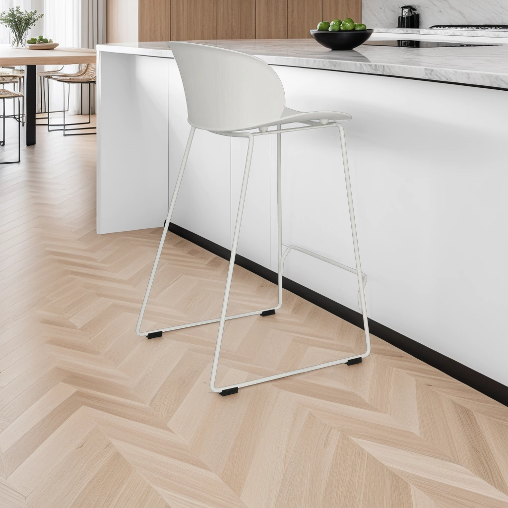 Hoker Vivia bílý od značky Intesi je moderní barová židle s opěrkou, navržená pro každodenní pohodlí při používání v kuchyni nebo u kuchyňského ostrůvku. Tento hoker spojuje minimalistický design, pevnou kovovou konstrukci na lyžinách a ergonomické sedadlo z plastu, což zaručuje komfort i při delším sezení. Výška sedáku 66 cm z něj dělá ideální volbu k většině kuchyňských ostrůvků a vysokých pracovních desek.