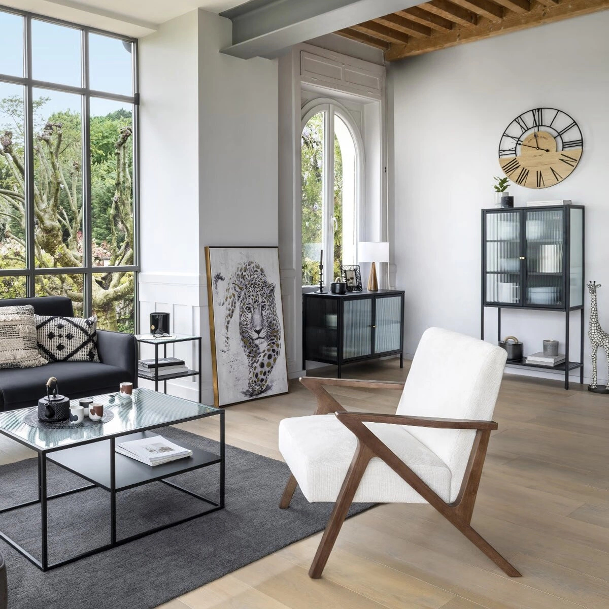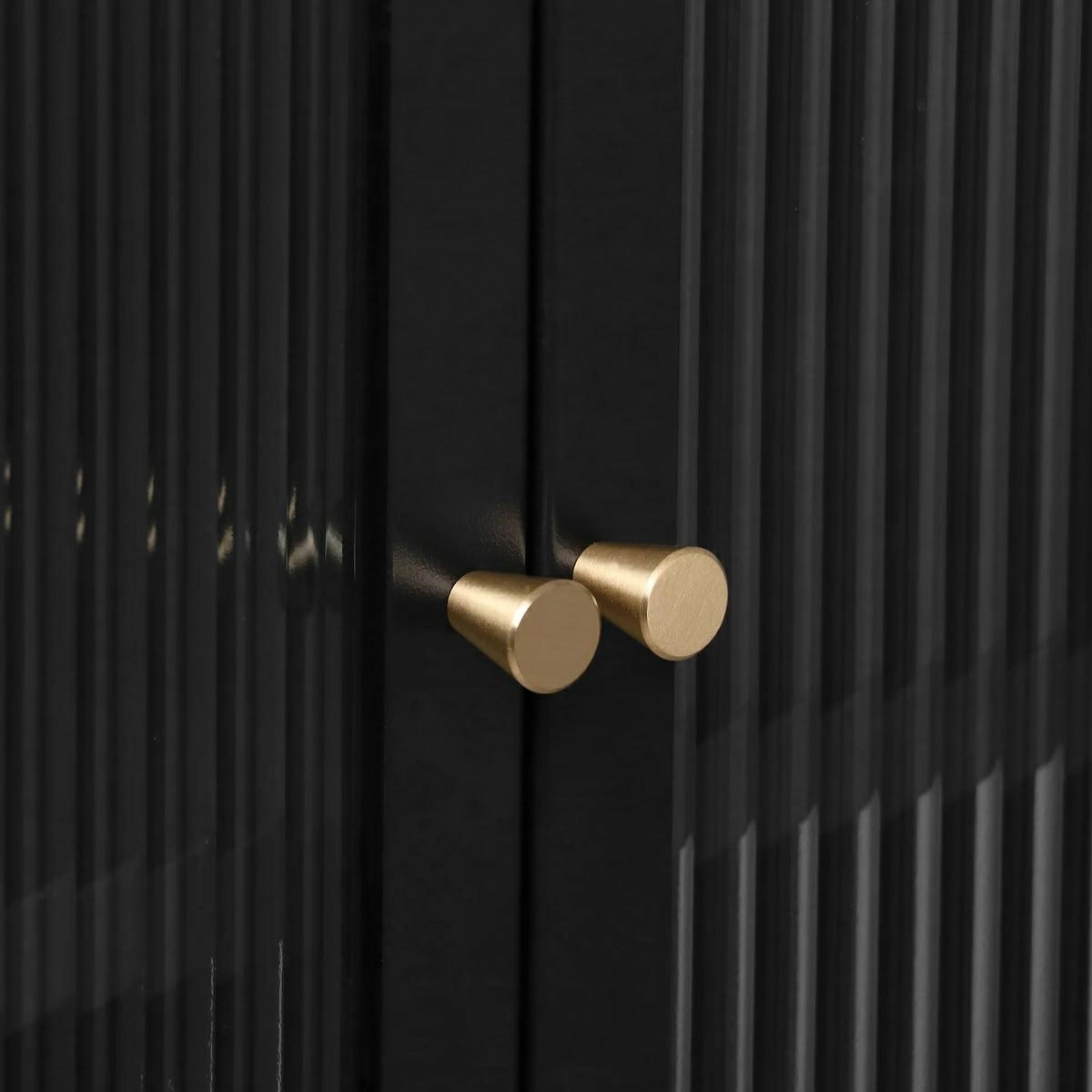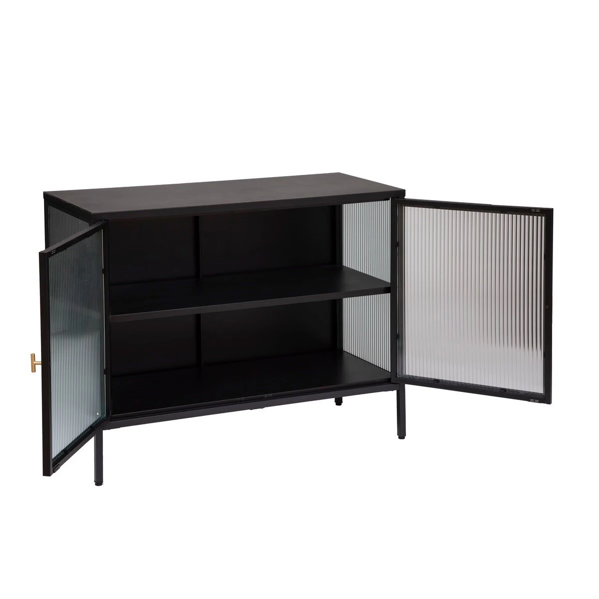 Komoda Aldir od značky Atmosphera je moderní černá kovová komoda o šířce 100 cm, která zaujme prosklenými dvířky a stabilní konstrukcí na štíhlých nohách. Kombinace kovu a skla v elegantním polomatném provedení skvěle zapadá do industriálního a loftového stylu, zároveň ale poskytuje praktický úložný prostor do obývacího pokoje, ložnice nebo jídelny. Promyšlené uspořádání s jednou širokou policí umožňuje snadno vystavit i zorganizovat oblíbené dekorace, knihy nebo nádobí.