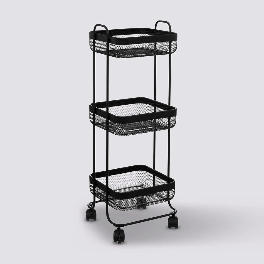 Tři praktické úrovně umožňují pohodlně uložit potraviny, koření, nádobí nebo čistící prostředky. Otevřená konstrukce zajišťuje rychlý přístup ke všem uloženým věcem, takže každodenní povinnosti budou jednodušší a lépe zorganizované. Vozík se hodí také jako mobilní regál na kosmetiku či drobné potřeby v domácí kanceláři.