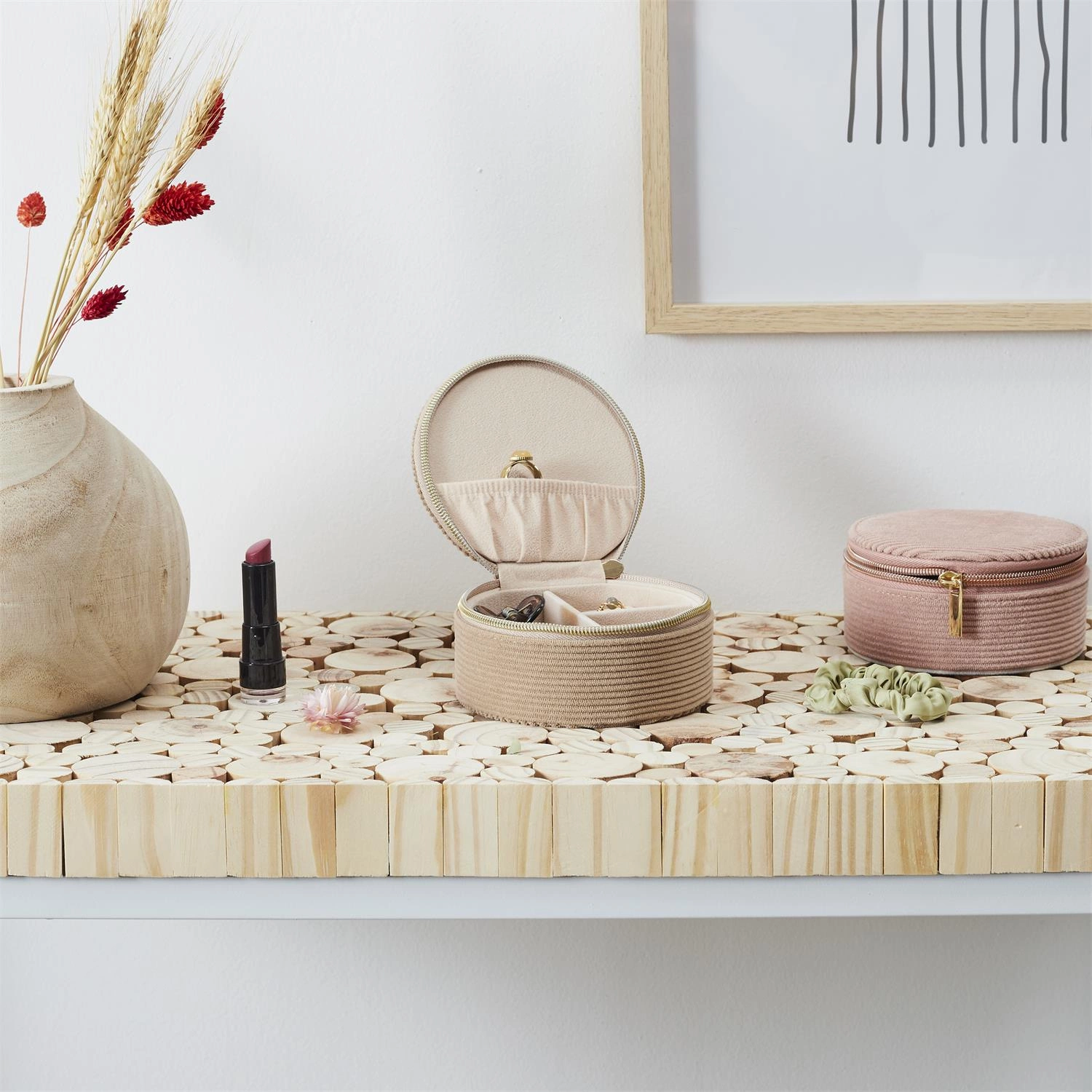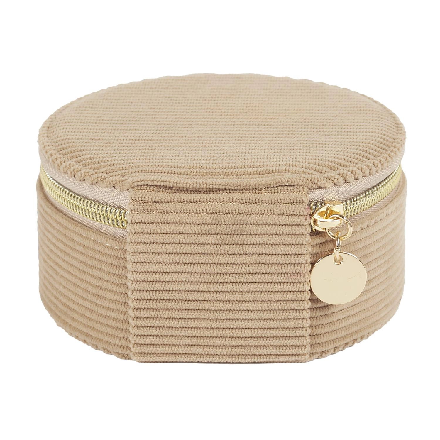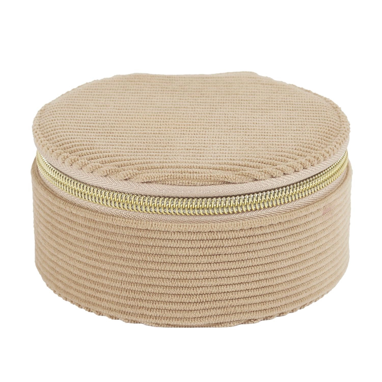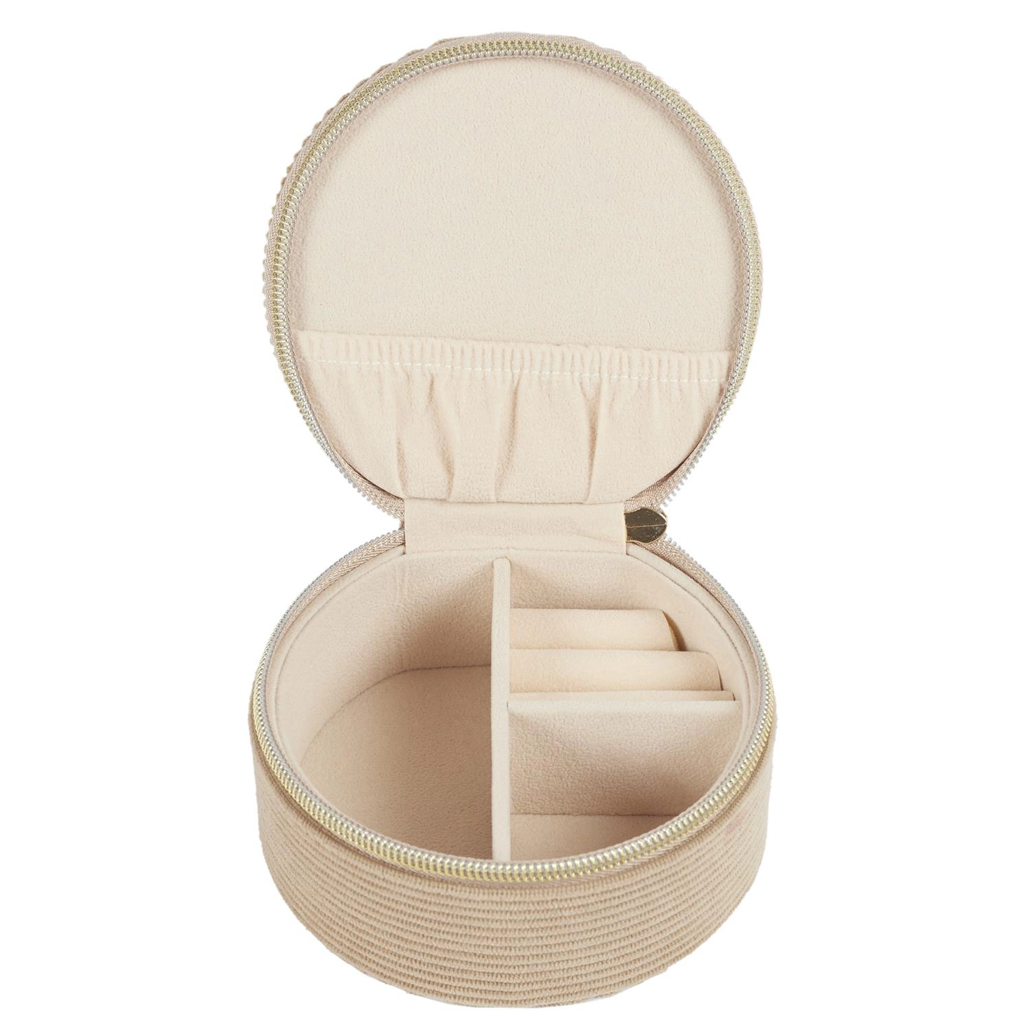 Organizer na šperky do zásuvky Velo od značky Intesi je praktické a stylové řešení, které vám pomůže udržet oblíbené doplňky přehledně uspořádané. Vyrobený z příjemného béžového manšestru spojuje moderní i klasický design. Kulatý tvar a vnitřní přihrádky zajišťují pohodlné uložení prstenů, náušnic či náramků, zatímco kompaktní rozměr 12,5×12,5×6,1 cm umožňuje snadné umístění organizéru do zásuvky šatníku nebo ložnice.