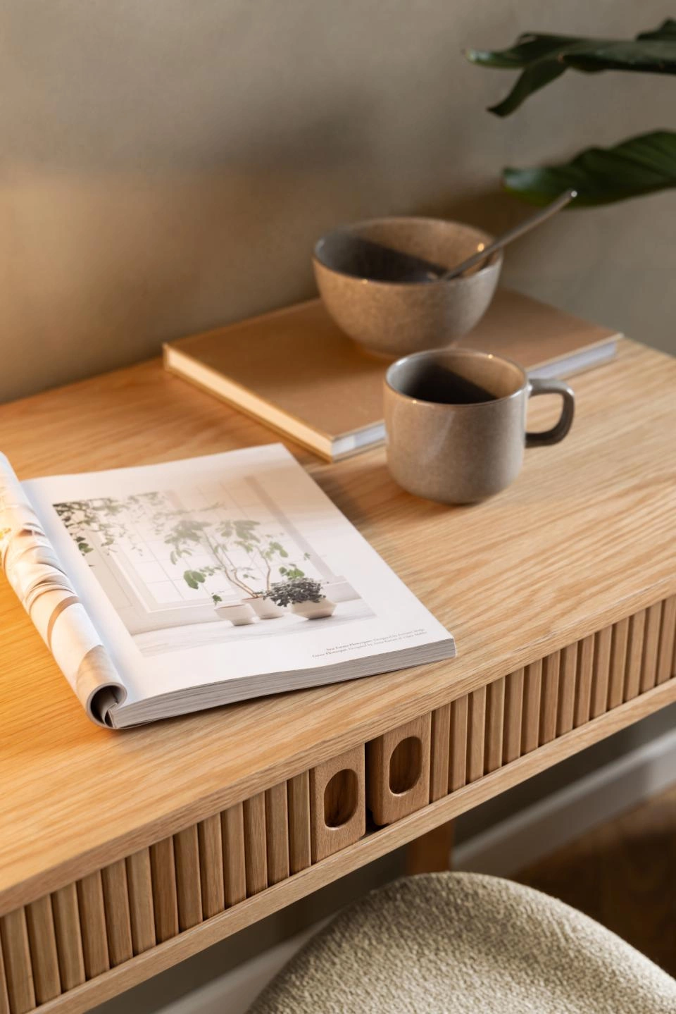 Psací stůl Langley je ideální volbou pro milovníky jednoduchosti a nadčasové elegance. Přirozený odstín dubu, svisle frézované čelní plochy a polomatná povrchová úprava mu dodávají lehkost a svěží vzhled. Stabilní dřevěná konstrukce na čtyřech nohách zajišťuje nejen pevnost, ale i jemný akcent inspirovaný skandinávským stylem. Stůl snadno začleníte jak do světlého obývacího pokoje, tak do útulné ložnice nebo moderního studentského pokoje.