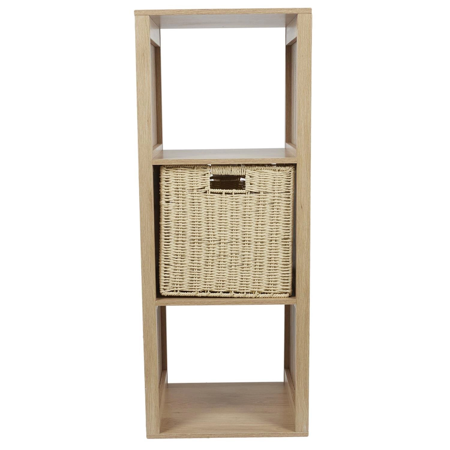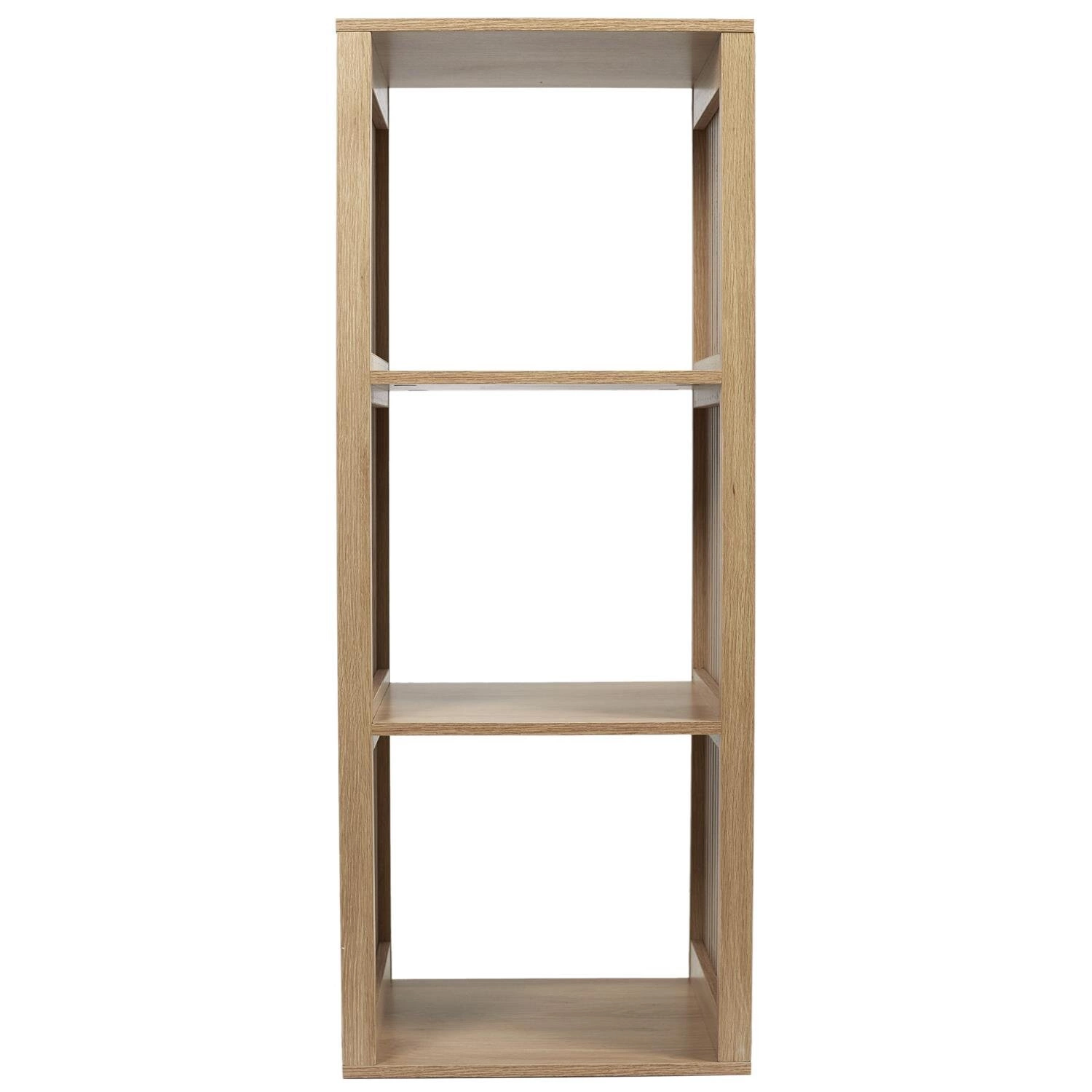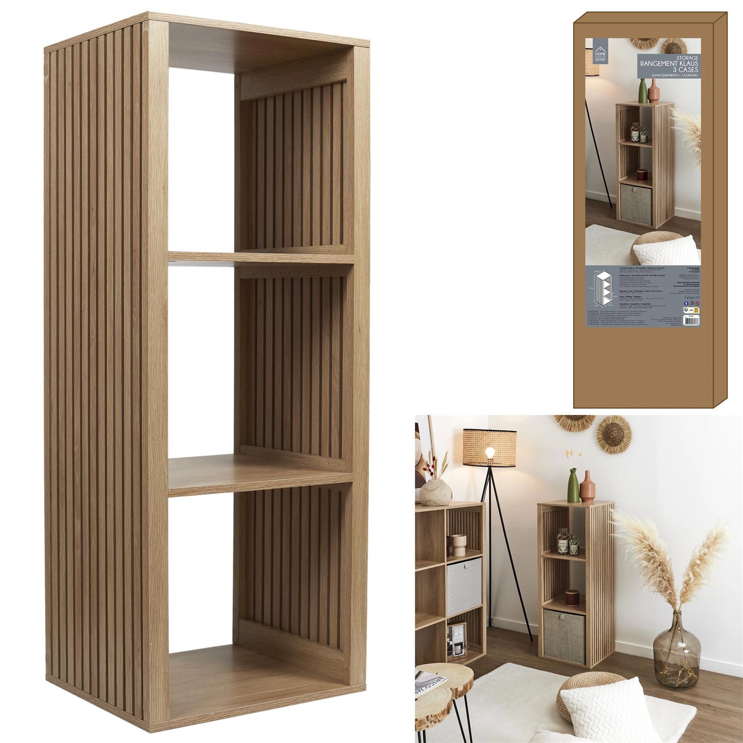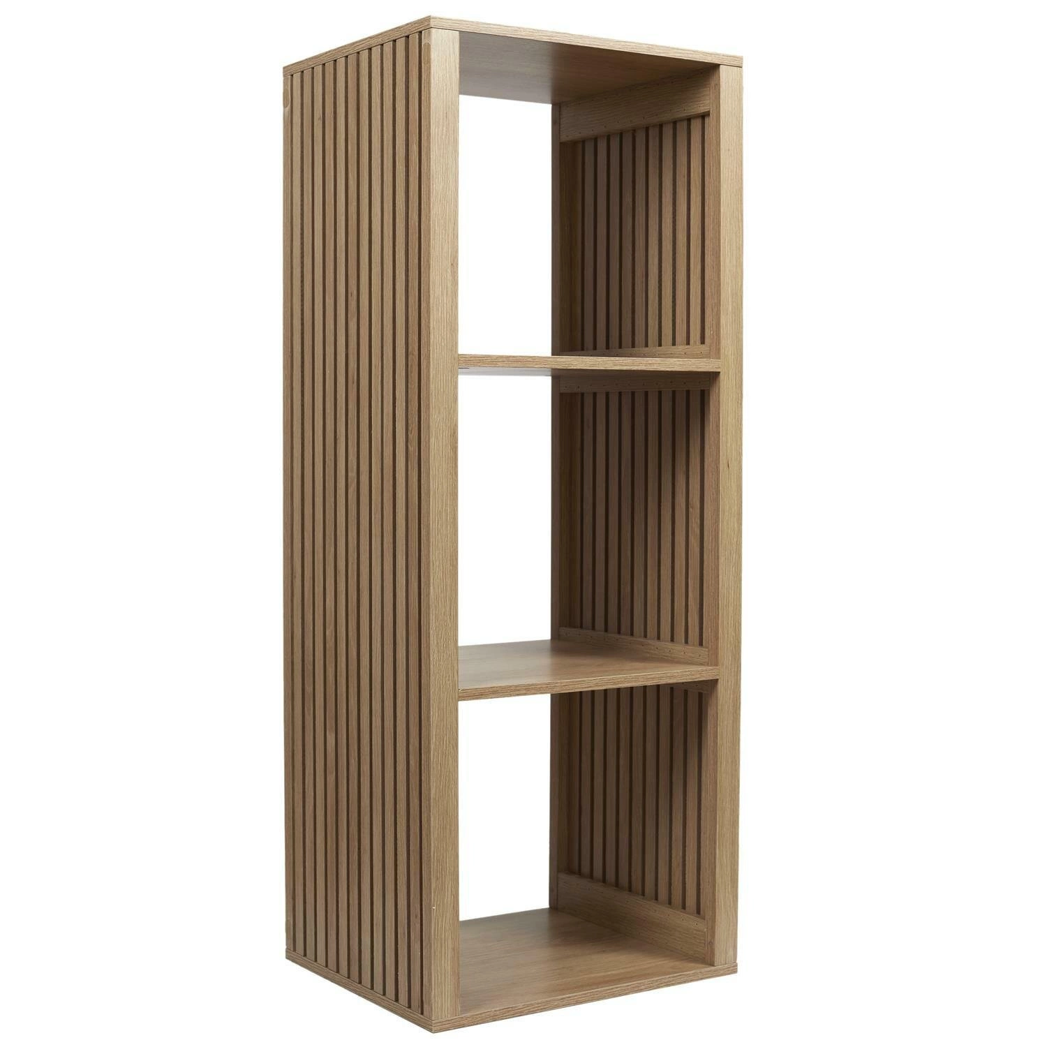 Knihovna z široké kolekce Klaus má především moderní design s lamelovým povrchem. Knihovnu tvoří 3 kubistické police, na které můžeme kromě předmětů, jako jsou hodinky nebo kniha, umístit také odkládací boxy. Materiál: MDF deska s dýhou v imitaci dřeva Maximální zatížení na jednu polici: rozměry kartonu: 6 kg Vyžaduje montáž: hmotnost: 12,7 kg, rozměry: 38x10,5x104,5 cm