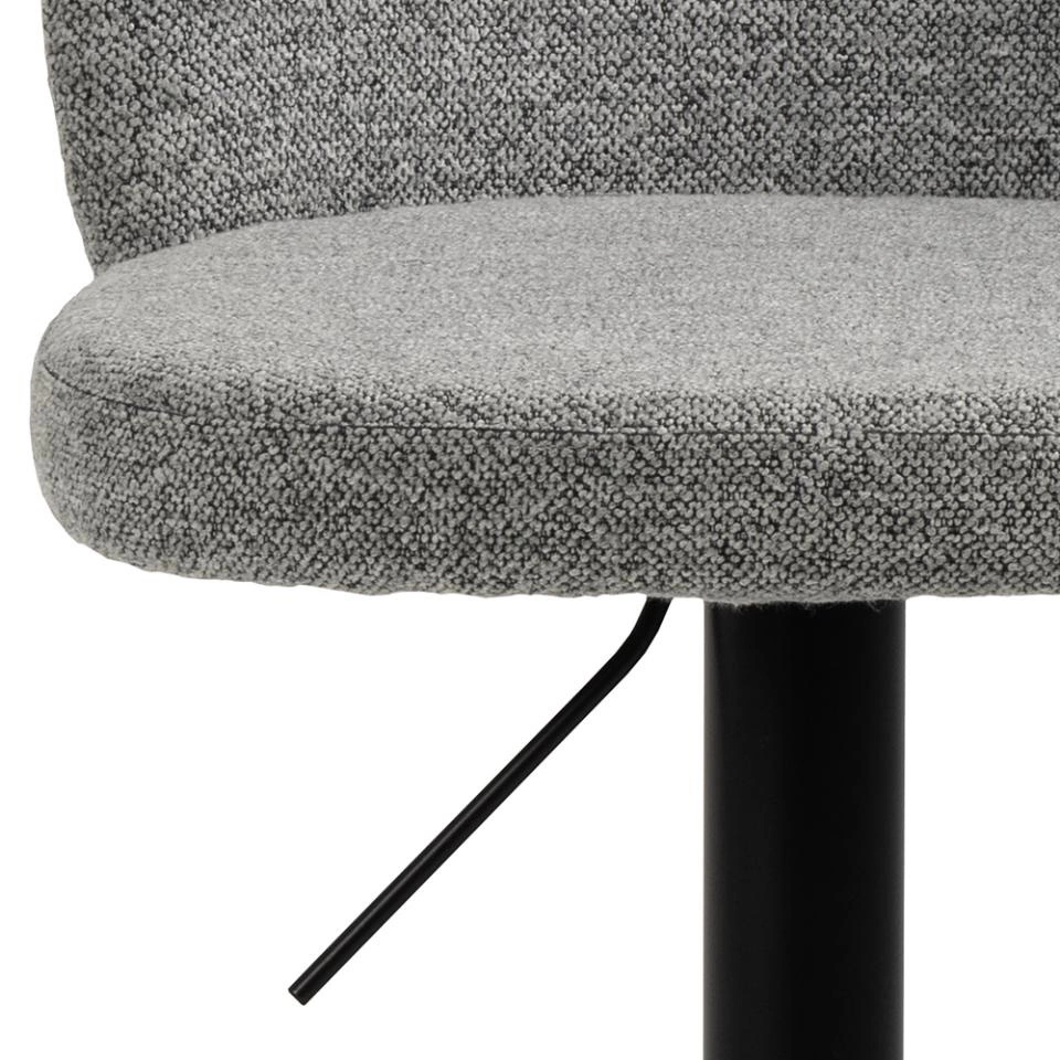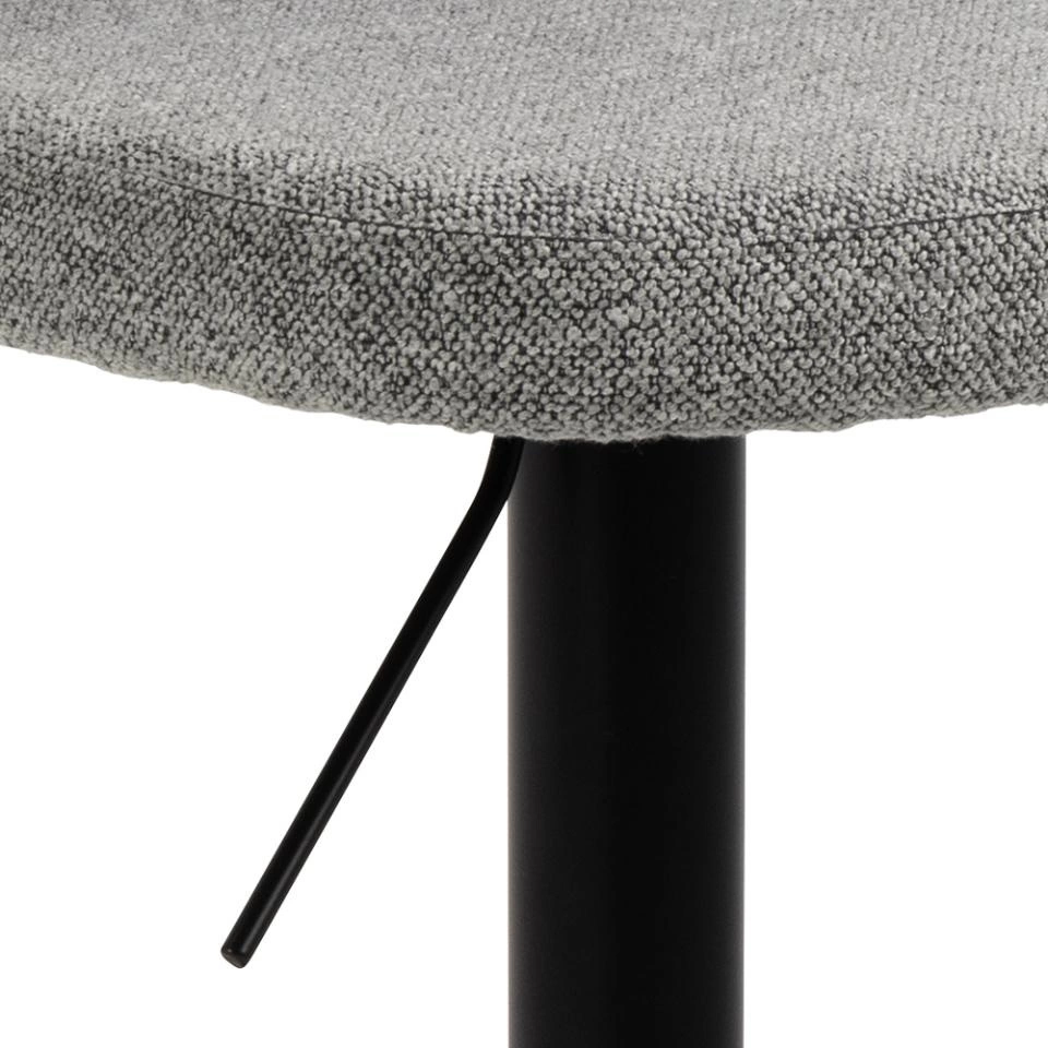 Šedý barový hoker Patricia je spojením elegance a praktičnosti. Matná povrchová úprava černé kovové základny skvěle zapadá do moderních interiérů a absence područek zajišťuje volnost pohybu. Otočná konstrukce umožňuje snadné otáčení směrem ke spolustolovníkům bez nutnosti posouvat židli, což výrazně zvyšuje pohodlí při používání.