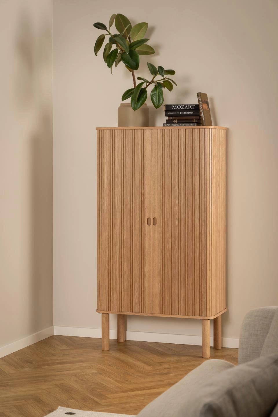 Vysoká komoda Langley od značky Actona je elegantní kombinací přírodního dubového dřeva a moderního designu na štíhlých nožkách. Šířka 80 cm a výška 145 cm z ní dělají praktický kus nábytku, který skvěle poslouží jako funkční komoda do obývacího pokoje, ložnice nebo jídelny. Frézovaná, vertikální dvířka s polomatnou úpravou podtrhují styl a jedinečný charakter – ideální volba pro milovníky moderních dřevěných komod na nožkách.