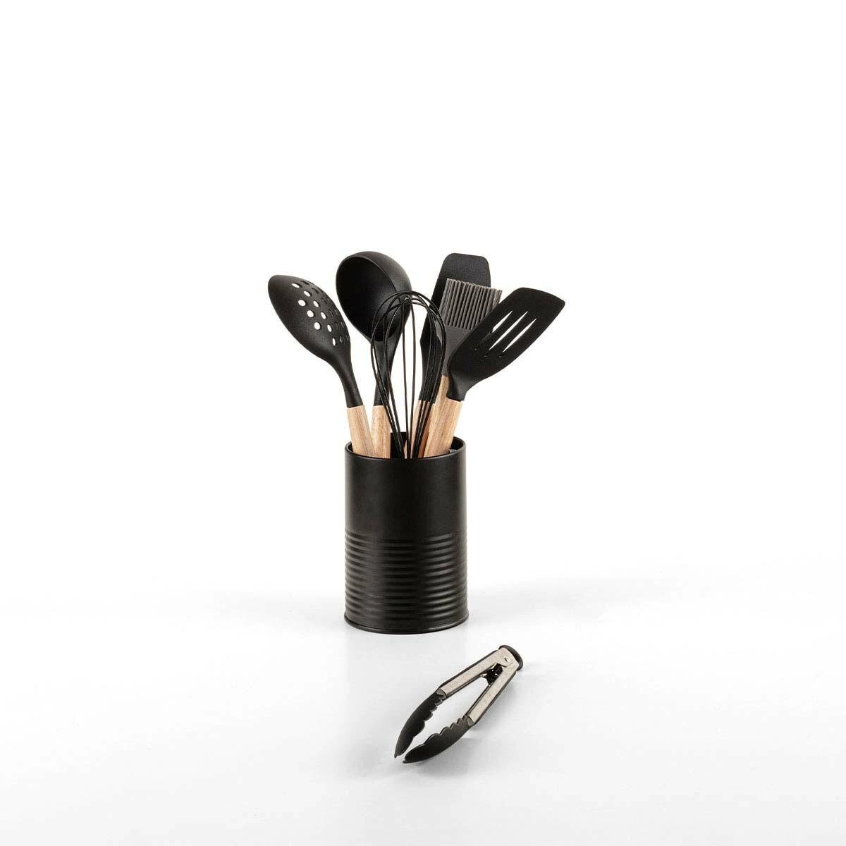Kovová nádoba, v níž jsou tyto praktické nástroje shromážděny, nejen pomáhá udržovat pořádek, ale také dodává elegantní a moderní nádech. Černé doplňky s jemnými dřevěnými detaily jsou nejen praktické, ale poskytují také designový akcent, který se skvěle hodí do moderních kuchyňských interiérů. Tato sada představuje kompletní paletu nezbytných kuchyňských nástrojů, včetně kovového hrnce, kleští na topinky, obracečky, štětce, metly, naběračky, cedicí lžíce a ažurové lopatky. Každý kus byl pečlivě navržen tak, aby usnadnil každodenní přípravu jídla a zároveň zachoval estetický vzhled.