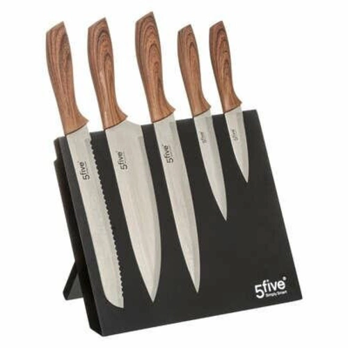 Sada 5 kuchyňských nožů s magnetickou deskou značky 5five simply smart je promyšlenou volbou pro ty, kteří ocení pohodlí, bezpečnost a styl při každodenním vaření. Ideální jak pro začátečníky, tak pro vášnivé kuchaře – umožní vám připravit každé jídlo s opravdovou lehkostí.