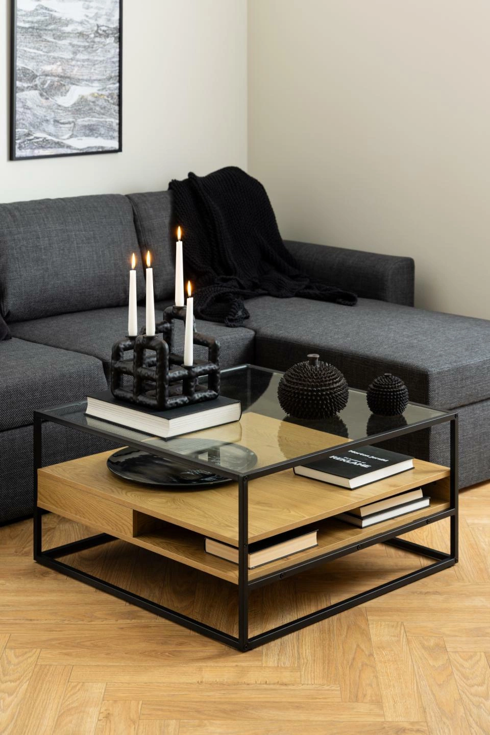 Kávový stolek Randolf od Actona je ideální volbou pro ty, kdo hledají elegantní a zároveň praktický nábytek do obývacího pokoje, pracovny nebo salonu. Čtvercová deska o rozměrech 80×80 cm je vyrobena z odolného tvrzeného skla, dvě přídavné police v dekoru přírodního dubu a pevná černá kovová konstrukce vytvářejí výrazný a moderní loftový kávový stolek, který skvěle zapadne do industriálních, skandinávských i klasických interiérů.