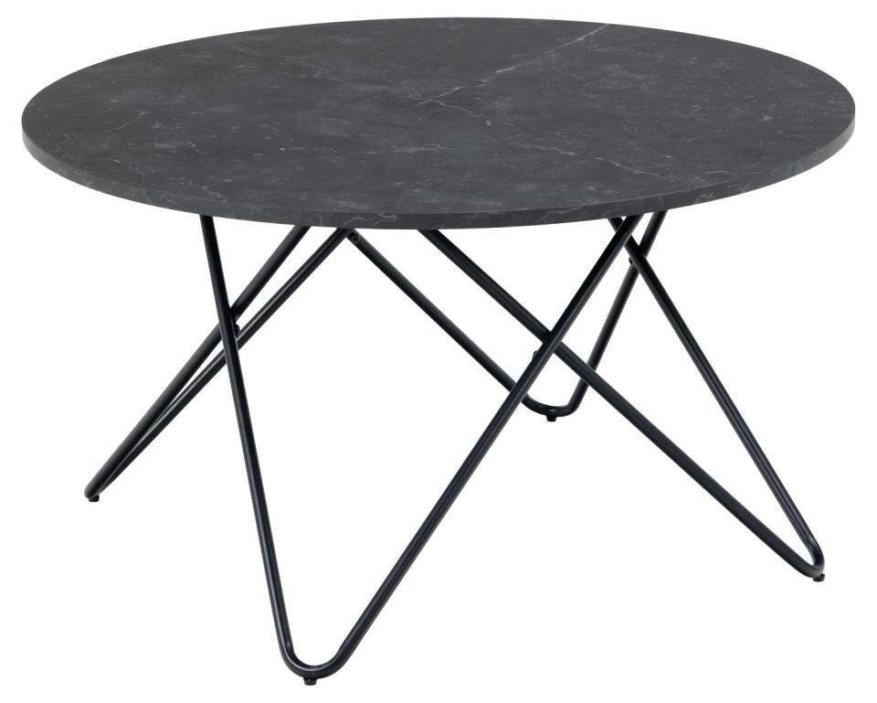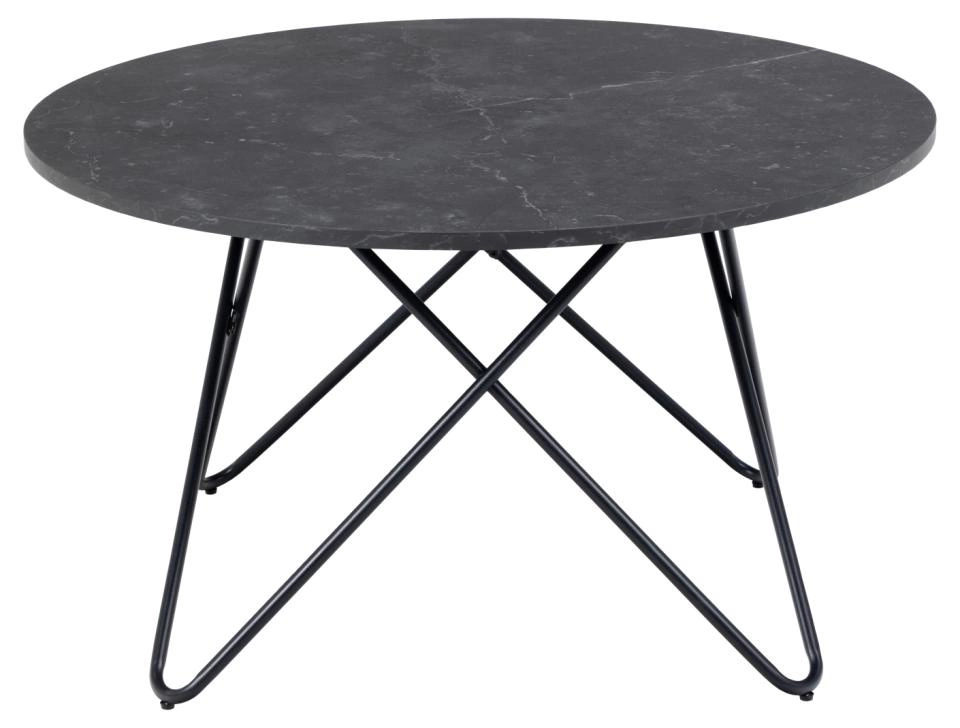 Stolek kawový Wyre kulatý 80 cm černý mramor moderní loftový do obývacího pokoje Actona je ideální volbou pro ty, kteří hledají výrazný prvek do obýváku, pracovny nebo stylové kavárny. Kulatá deska o průměru 80 cm je vyrobena z odolné MDF desky s matnou povrchovou úpravou v dekoru černého mramoru, která perfektně ladí s černou ocelovou podnoží na čtyřech nohách. Tento moderní stolek spojuje loftový styl, eleganci glamour a praktičnost – je skvělým řešením jak pro každodenní odpočinek, tak pro posezení s přáteli.