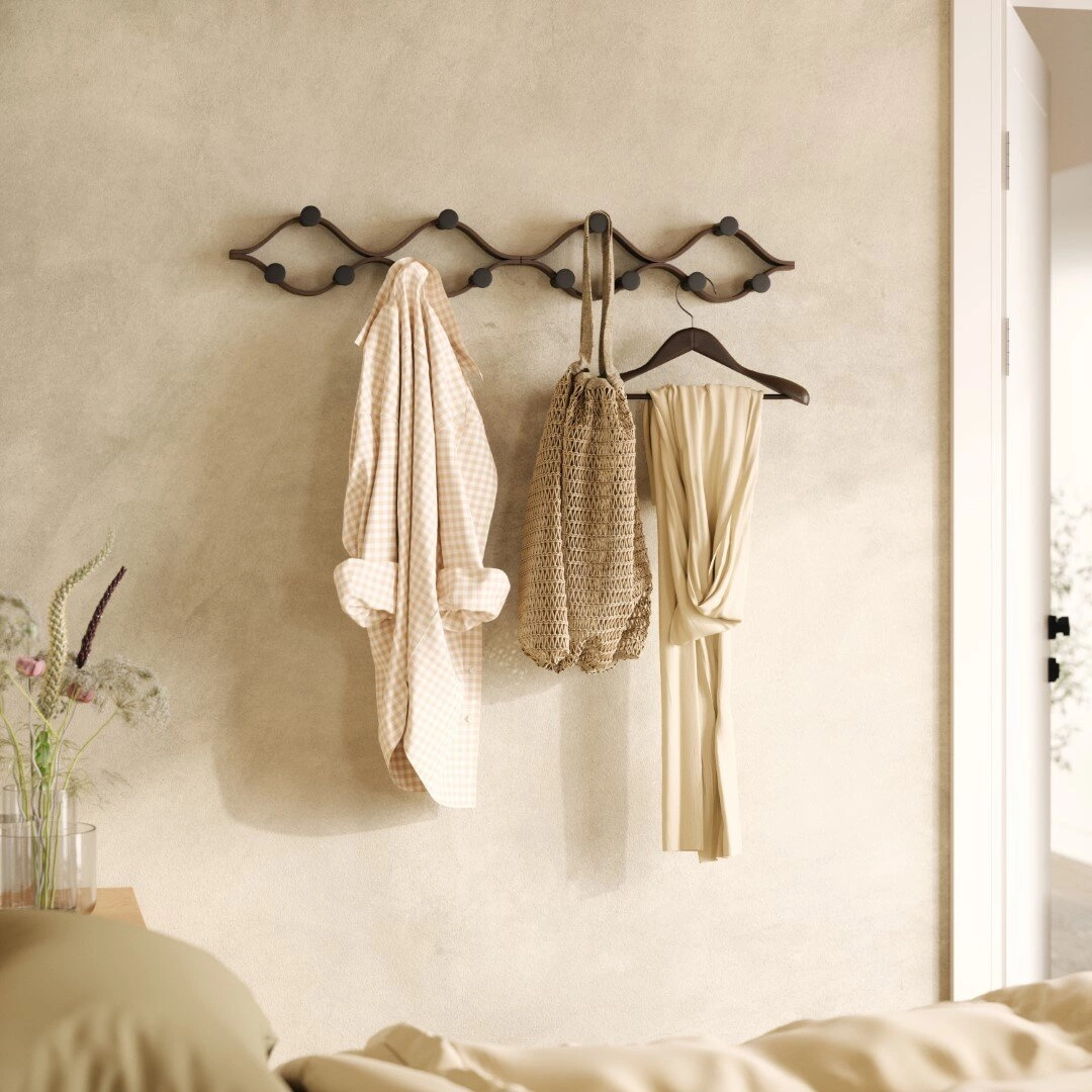 Jednoduchá montáž nástěnného věšáku umožňuje rychlé připevnění na stěnu, takže okamžitě získáte místo na bundy, kabáty či doplňky. Pevné dřevěné háčky odolávají každodennímu používání a hladký povrch usnadňuje údržbu a čištění. Věšák Montage se uplatní nejen jako praktický doplněk do předsíně, ale také do šatny nebo koupelny, například jako věšák na ručníky či lišta na klíče.