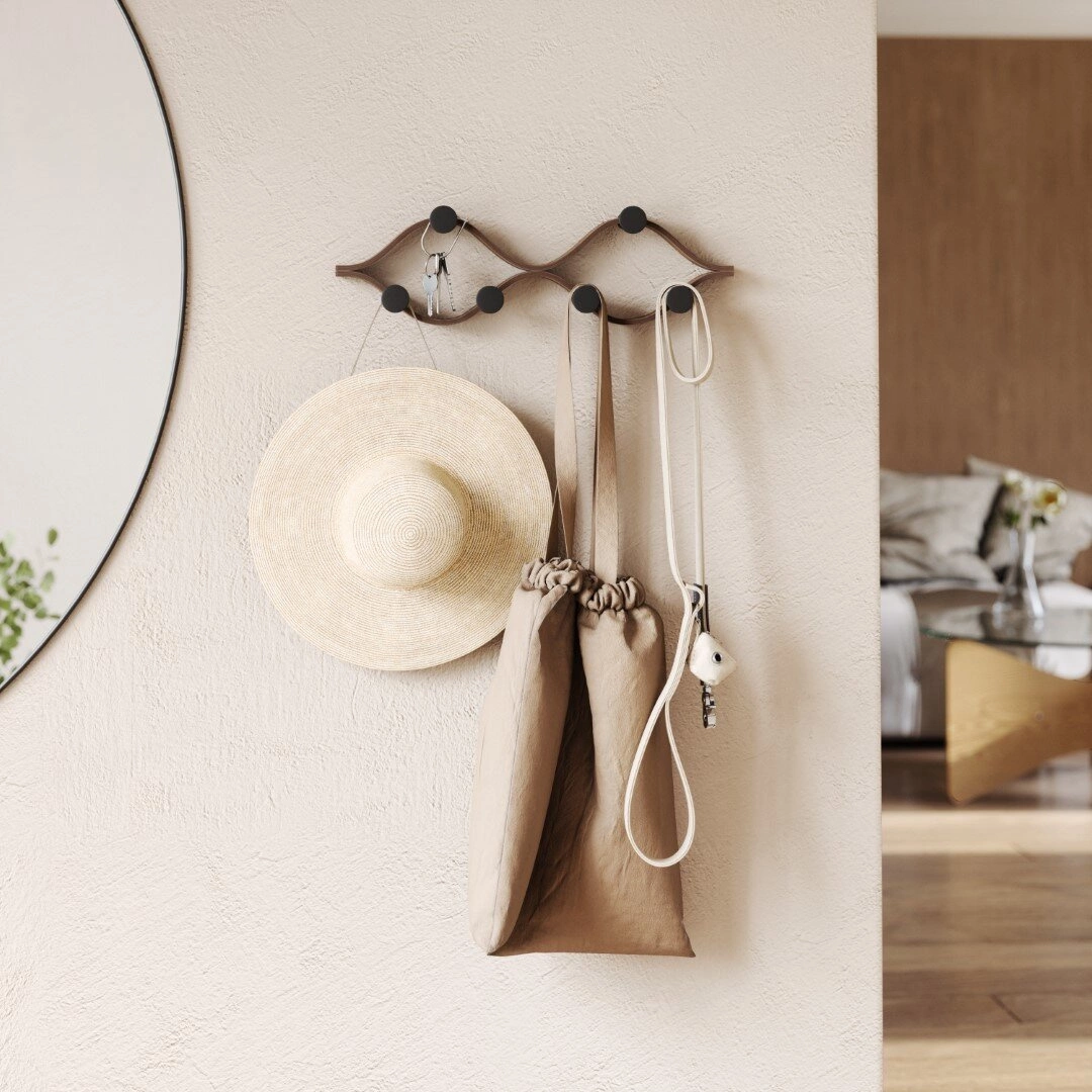 Nástěnný věšák Umbra Montage představuje spojení moderního designu a funkčnosti, které oživí vaši předsíň. Model o šířce 43 cm a výšce 13 cm je vyroben z přírodního kaučukového a jasanového dřeva, kde se snoubí ušlechtilý ořechový odstín s elegantní černou. Disponuje 6 odolnými háčky, což zaručuje pohodlné uložení bund, kabátů, kabelek či klíčů bez zabírání dalšího prostoru. Perfektně se hodí jako moderní věšák do předsíně, který podtrhne styl vašeho interiéru a nabídne praktické řešení pro každý den.