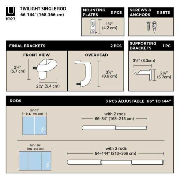 Díky širokému rozsahu nastavení (168–366 cm) máte jistotu, že jednoduchá garnýž Umbra Twilight černá bude vhodná i pro nestandardní rozměry oken. Pevná kovová konstrukce unese až 10 kg, takže můžete bez obav zavěsit i těžší zatemňovací závěsy. Montáž je velmi jednoduchá – ideální volba pro ty, kteří oceňují rychlou a bezproblémovou instalaci.