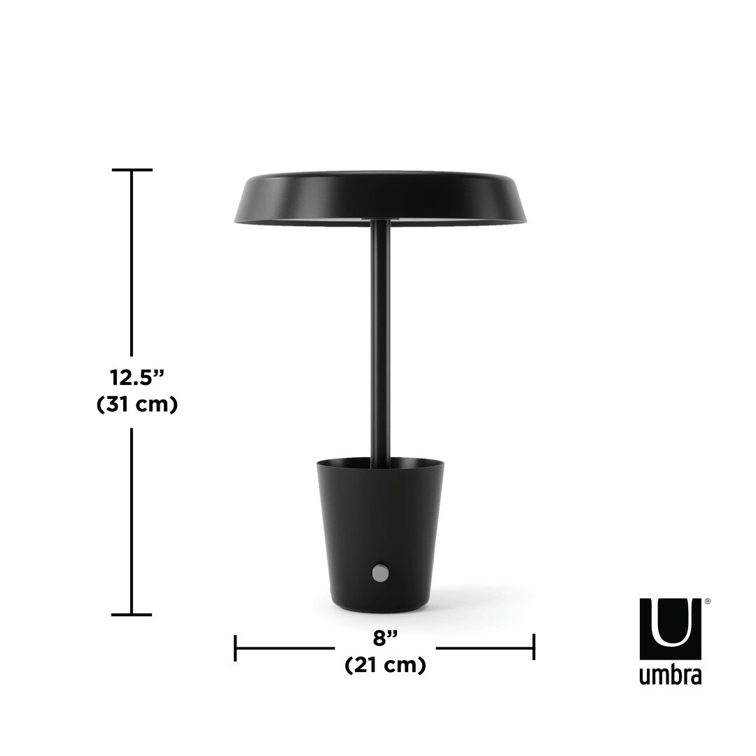 Černé matné tělo z odolného plastu skvěle zapadne do moderního interiéru ložnice, obývacího pokoje nebo kanceláře. LED stolní lampa Cup Smart Umbra je nejen designovým doplňkem – její základna je navržena pro maximální praktičnost. Pohodlně do ní uložíte drobnosti jako propisky, hodinky nebo mobilní telefon a udržíte tak pořádek na stole. Výkon 90 W a světelný tok 320 lumenů zajistí příjemné osvětlení pro čtení i práci na počítači.