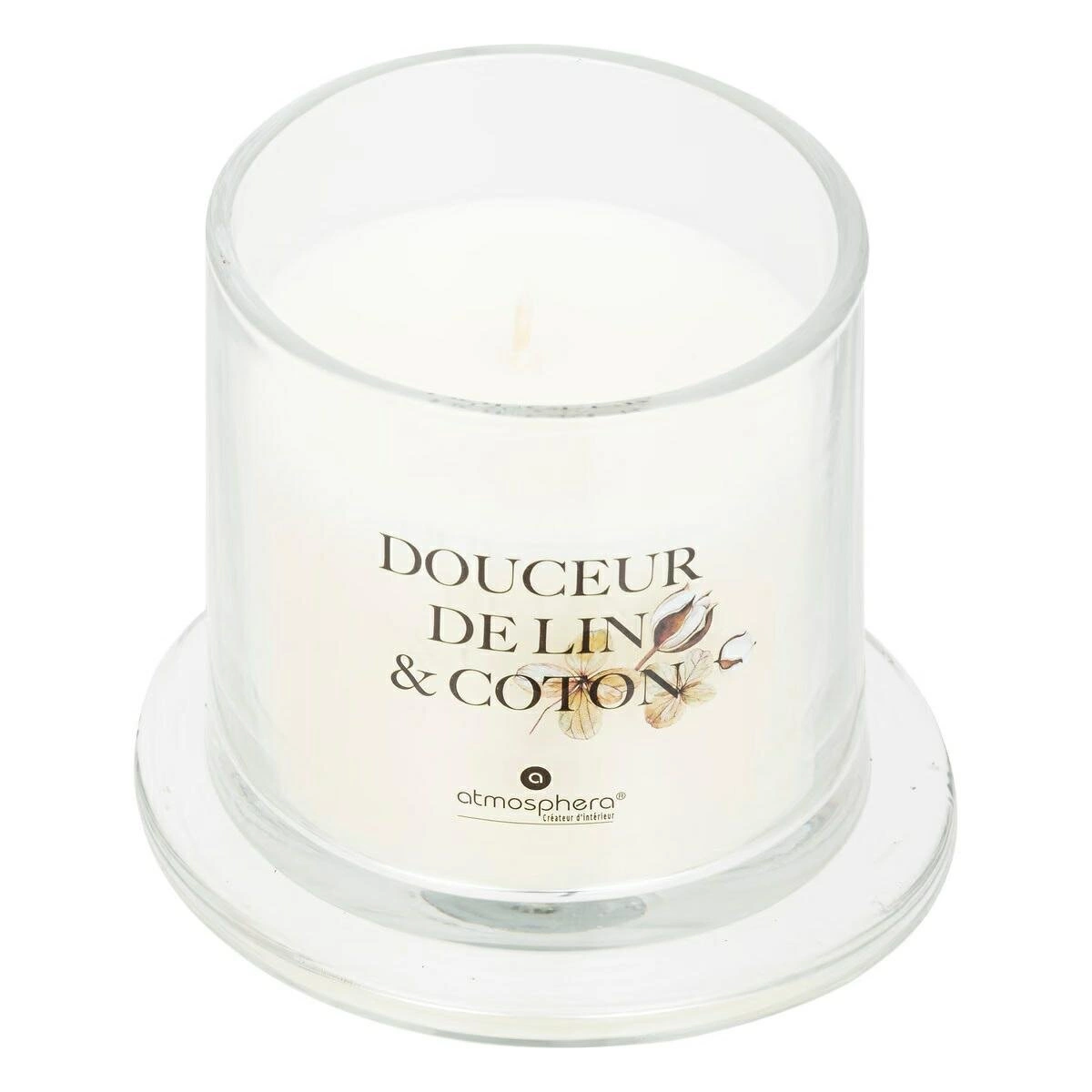 Vonná svíčka Oudy bavlna a len pod skleněným poklopem značky Atmosphera je stylová dekorace o výšce 14 cm a průměru 10,8 cm, která v sobě spojuje eleganci průhledného skla a jemnou vůni čisté bavlny. Vyrobena z kvalitního parafínového a přírodního palmového vosku, s bavlněným knotem, zajišťuje dlouhotrvající a rovnoměrné hoření. Praktický skleněný poklop chrání svíčku, zdůrazňuje její dekorativní vzhled a činí z ní ideální volbu do obývacího pokoje, ložnice nebo pracovny.