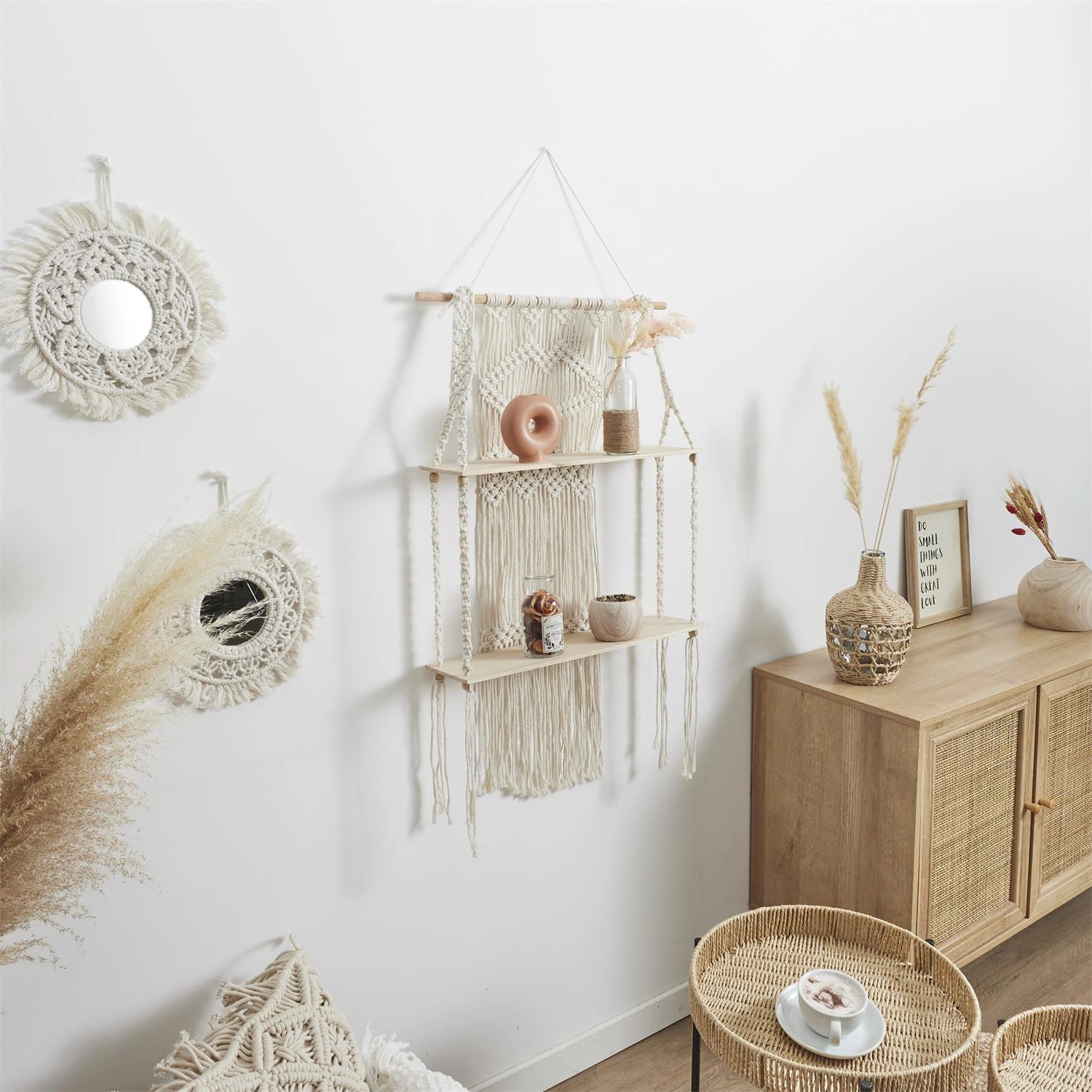 Nástěnná police Boho značky Intesi je výjimečná závěsná police ze dřeva o délce 85 cm, vyrobená z přírodního borovicového dřeva a bavlněného provazu v odstínech béžové a krémové. Díky dvěma praktickým policím a ručně pleteným makramovým prvkům perfektně zapadá do boho stylu, přičemž nabízí nejen praktičnost, ale i originální charakter. Nástěnná police Boho bude nevšední ozdobou každé stěny, ideální pro vystavení dekorací, květin či oblíbených drobností.