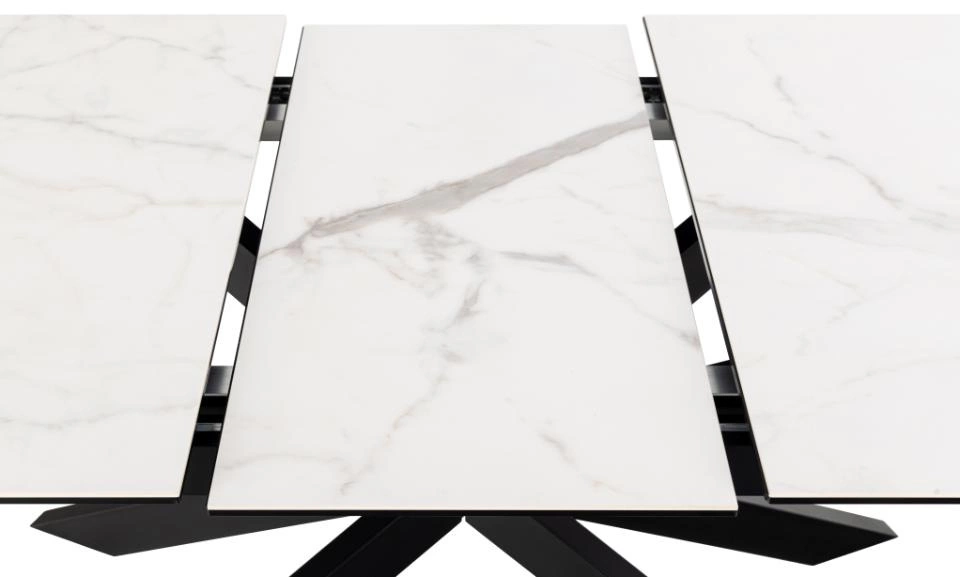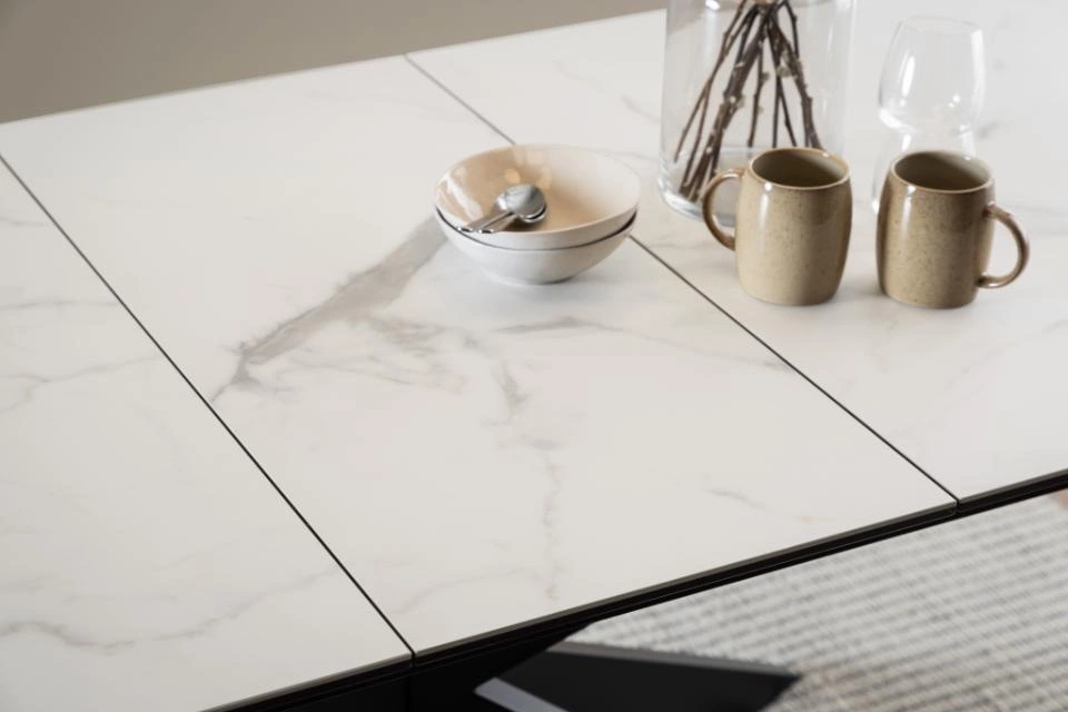 Deska stolu Irwine Akranes je vyrobena z kvalitní bílé keramiky, která nejen zaujme na pohled, ale také nabízí výjimečnou odolnost vůči poškrábání, vysokým teplotám i znečištění. Matný povrch působí velmi moderně a zároveň se snadno udržuje – stačí jej otřít vlhkým hadříkem a stůl bude vypadat perfektně každý den. Díky tomu je tento stůl ideální jak jako centrální místo pro rodinné obědy, tak i jako elegantní stůl do obývacího pokoje pro hosty.