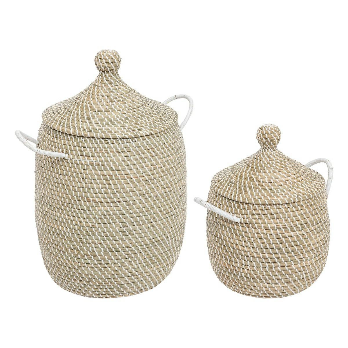 Sada 2 boho úložných košů Soleya od značky Atmosphera je praktickým a stylovým řešením pro všechny, kdo oceňují přírodní design a funkčnost. Koše jsou vyrobeny z pletené slámy v přírodní a bílé barvě, díky čemuž se skvěle hodí jako koš na hračky, úložný box na oblečení nebo doplňky. V sadě najdete dva rozměry: větší s výškou 58 cm a šířkou 39 cm a menší – 40 cm vysoký a 30 cm široký, oba s dokonale padnoucími víky.
