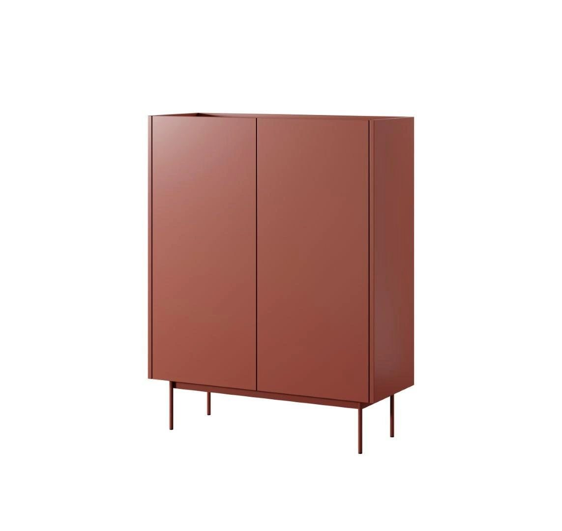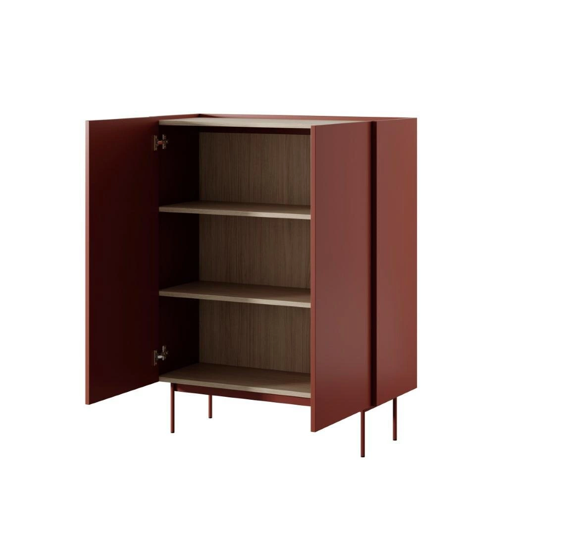 Vysoká komoda Cashmer značky Intesi je moderní kus nábytku o výšce 122 cm a šířce 97 cm, který na první pohled zaujme intenzivní červenou barvou a elegantní siluetou na štíhlých kovových nožkách. Je vyrobena z odolné laminované desky s polomatnou povrchovou úpravou. Komoda nabízí tři prostorné police ukryté za dvěma hladkými dvířky, což zajišťuje pohodlné ukládání v obývacím pokoji, ložnici či předsíni. Jednoduchý, minimalistický design se zde snoubí s funkčností a vytváří ideální komodu pro moderní interiéry.