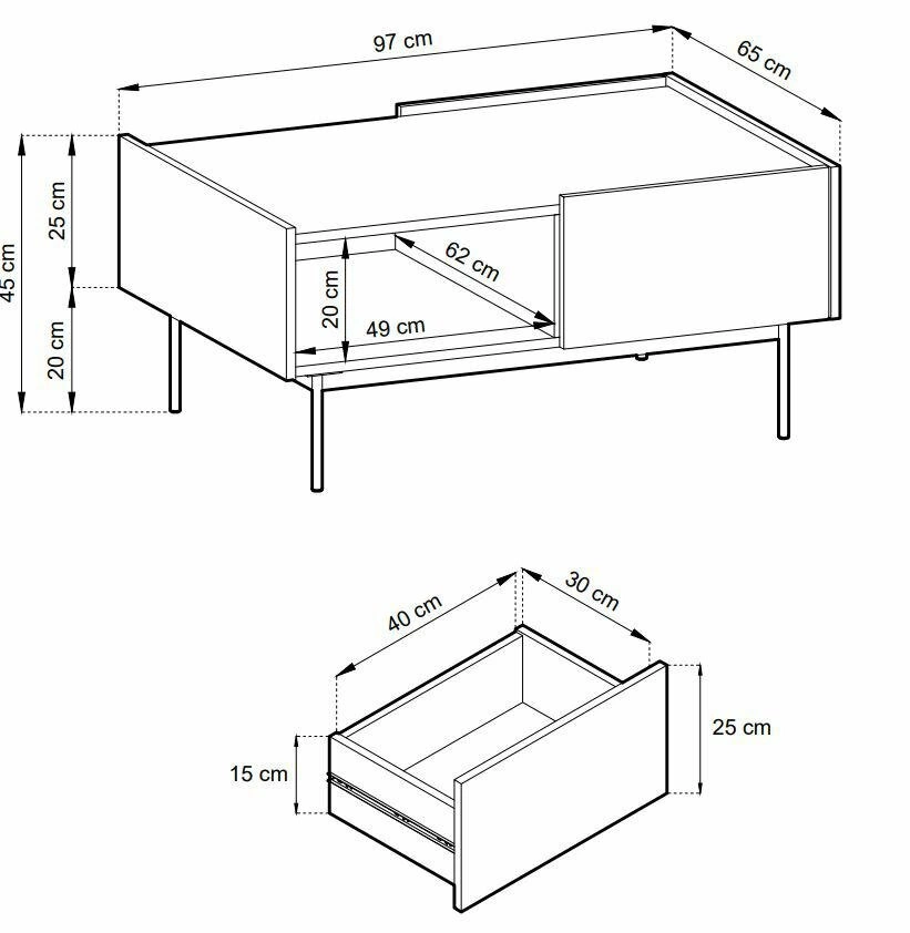 Moderní konferenční stolek do obývacího pokoje Cashmer je navržen s důrazem na každodenní pohodlí. Výška 45 cm perfektně ladí se standardními pohovkami a usnadňuje dosažení na nápoje nebo občerstvení během rodinných setkání. Laminovaná deska se snadno čistí, takže případné nečistoty odstraníte během chvilky. Kovové nohy zajišťují stabilitu a nosnost až 30 kg, proto na stole bezpečně umístíte i těžší předměty, jako je váza s květinami nebo kávový servis.- Praktické zásuvky a police – více úložného prostoru pro snadné udržení pořádku v obývacím pokoji.