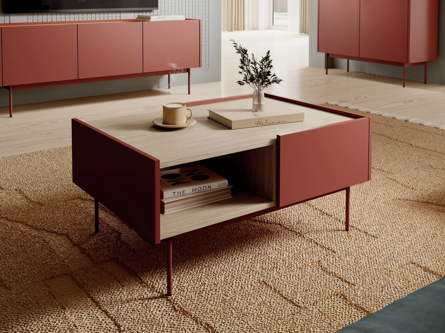 Obdélníkový konferenční stolek Cashmer od značky Intesi představuje spojení moderního designu, praktických detailů a výrazného barevného provedení. Deska o rozměrech 97x65 cm je vyrobena z odolné laminované desky v přírodním odstínu, stabilní kovová konstrukce v červené barvě a dvě prostorné zásuvky spolu s otevřenou policí zajišťují, že tento konferenční stolek se stane centrem relaxační zóny vašeho obýváku. Díky univerzálnímu charakteru a nadčasovému skandinávskému a glamour stylu jej snadno sladíte s nejmodernějšími trendy interiérového designu.Poznejte moderní konferenční stolek Cashmer blíže