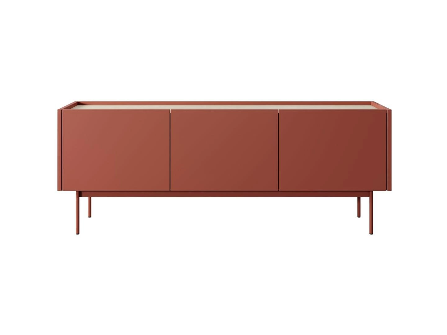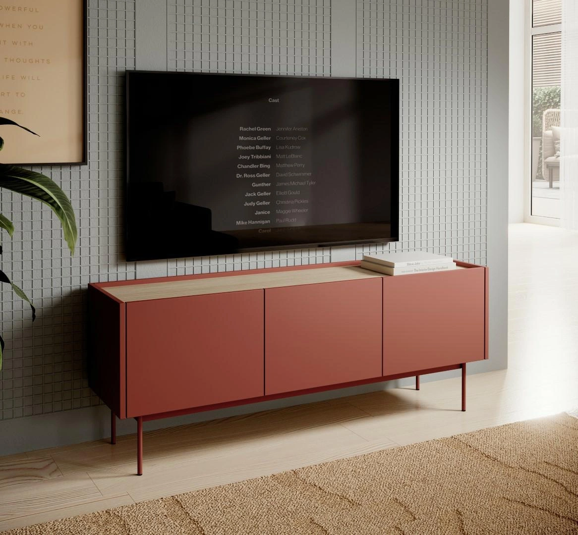 RTV skříňka Cashmer červená 144 cm od značky Intesi je výjimečný kus nábytku do obývacího pokoje, který spojuje moderní design, funkčnost a výraznou, matnou červenou barvu. Se šířkou 144 cm a výškou 55 cm je tento stojící model na kovových nožkách ideální volbou jako TV stolek ve skandinávském stylu. Tři prostorné skříňky a hladké přední plochy poskytují praktický úložný prostor pro elektroniku i dekorace a celek upoutá pozornost odvážnou barvou a jednoduchými liniemi.