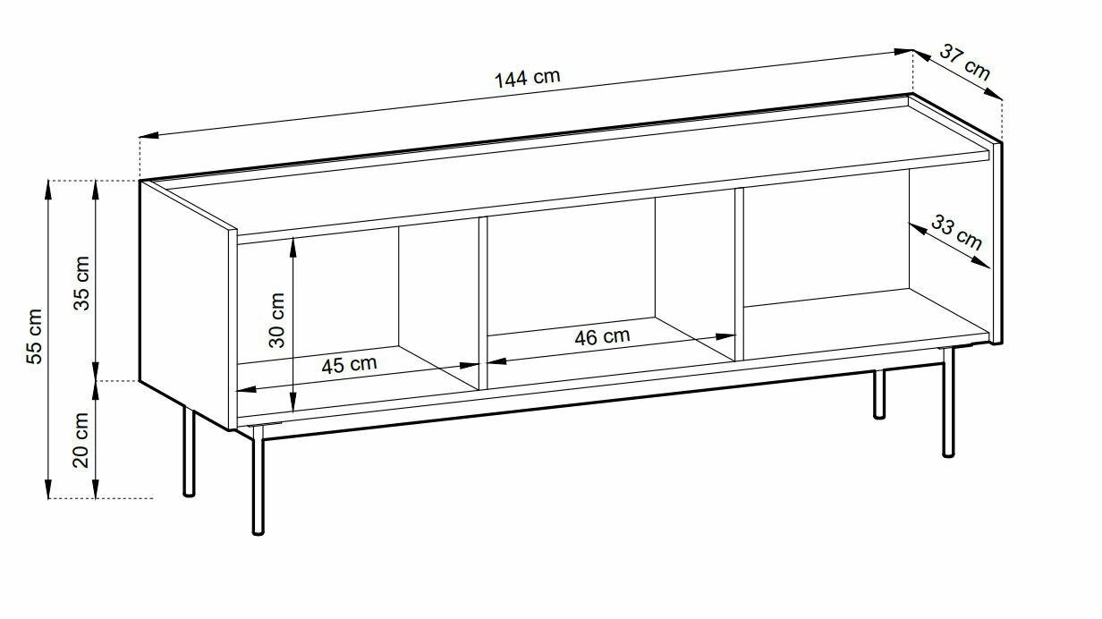 Stojící RTV skříňka Cashmer byla navržena s ohledem na pohodlí při každodenním používání. Tři samostatné skříňky umožňují přehledně uspořádat herní konzoli, set-top box, sbírku filmů i další drobnosti, takže udržet pořádek v obýváku je mnohem jednodušší. Výška 55 cm zajišťuje pohodlné umístění televize ve správné výšce, a šířka 144 cm je vhodná i pro větší obrazovky. Pevná konstrukce z kovu a laminované desky unese až 30 kg, což zaručuje bezpečné a dlouhodobé užívání.