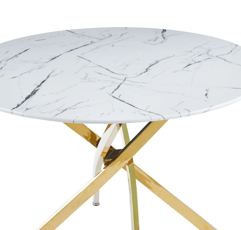 Kulatý skleněný stůl Edward bílý mramor od značky Intesi je ideální volbou pro milovníky elegance a moderního designu ve stylu glamour. Jeho kulatá deska o průměru 100 cm je vyrobena z tvrzeného skla s efektem bílého mramoru, což stolu dodává jedinečný charakter a zároveň zajišťuje snadnou údržbu. Stabilní základna na čtyřech zlatých nohách podtrhuje luxusní vzhled stolu a skvěle ladí jak s jídelnou, tak i s moderním obývacím pokojem.