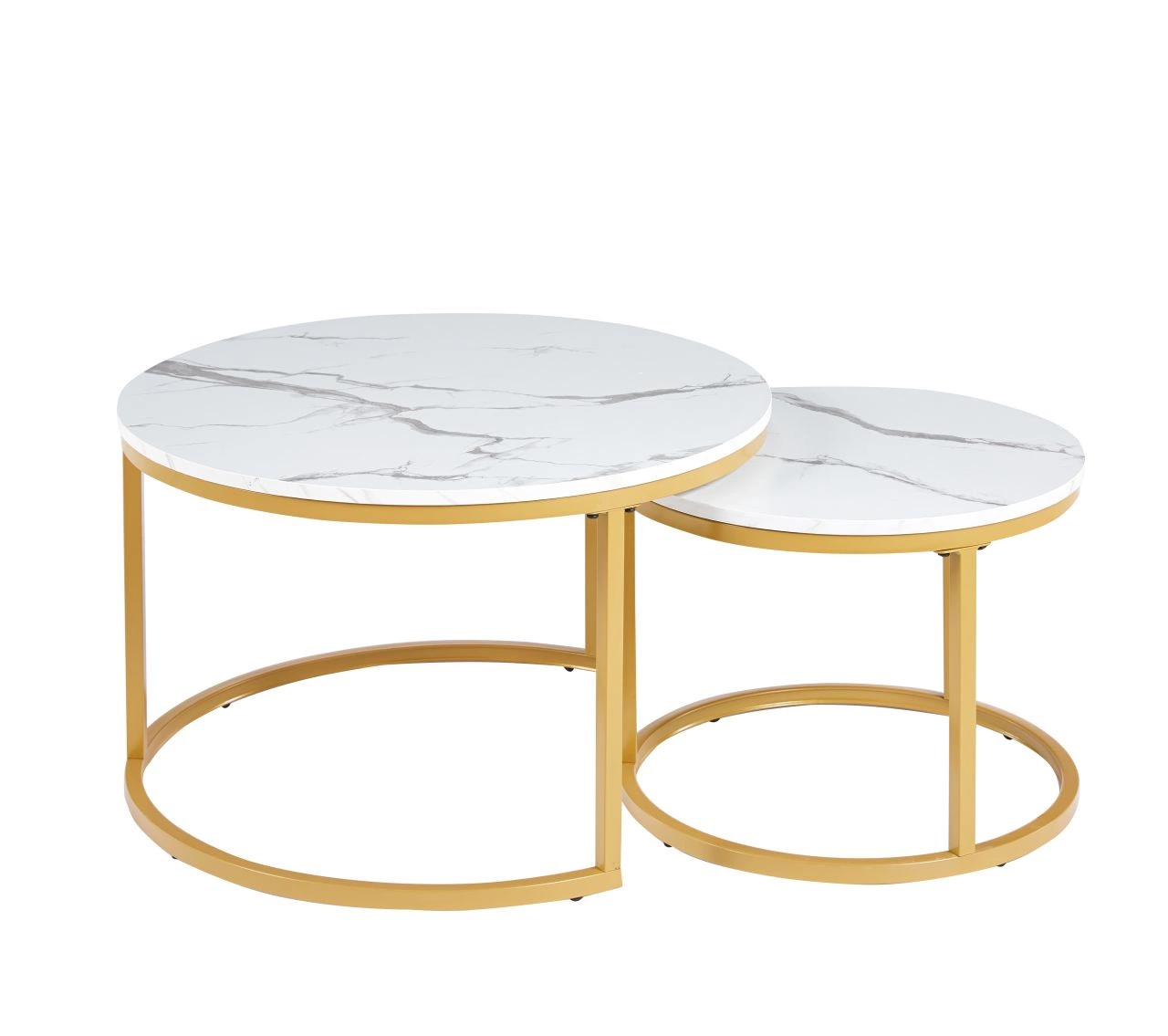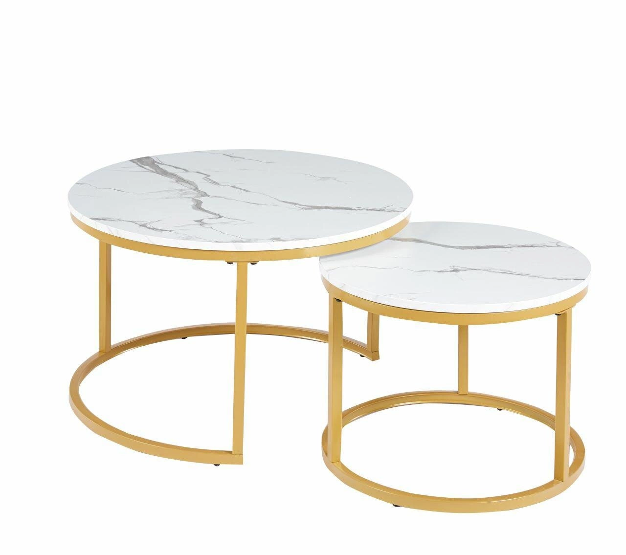 Větší stolek zaujme působivou deskou pr.ednice 70 cm, která v kombinaci s výškou 45,5 cm vytváří v místnosti ústřední bod. Deska z MDF desky pokrytá dýhou imitující bílý mramor jí dodává eleganci a styl, zatímco rám ve zlaté barvě jí dodává luxusní vzhled. Menší stolek s deskou pr.ednica o délce 50 cm a výšce 40 cm je dokonalým doplňkem soupravy. Jeho kompaktní rozměry umožňují flexibilní umístění vedle pohovky nebo křesla, čímž vznikne útulné posezení. Stejně jako u většího stolu mu bílá deska s imitací mramoru dodává eleganci, zatímco kovový rám ve zlaté barvě mu dodává jemný lesk. Oba stolky mají pevné nohy z práškově lakovaného kovu, které zajišťují stabilitu a trvanlivost používání. Díky své univerzálnosti a nadčasovému designu se sada 2 konferenčních stolků Bennett bude skvěle hodit do různých interiérů a dodá jim sofistikovaný nádech.