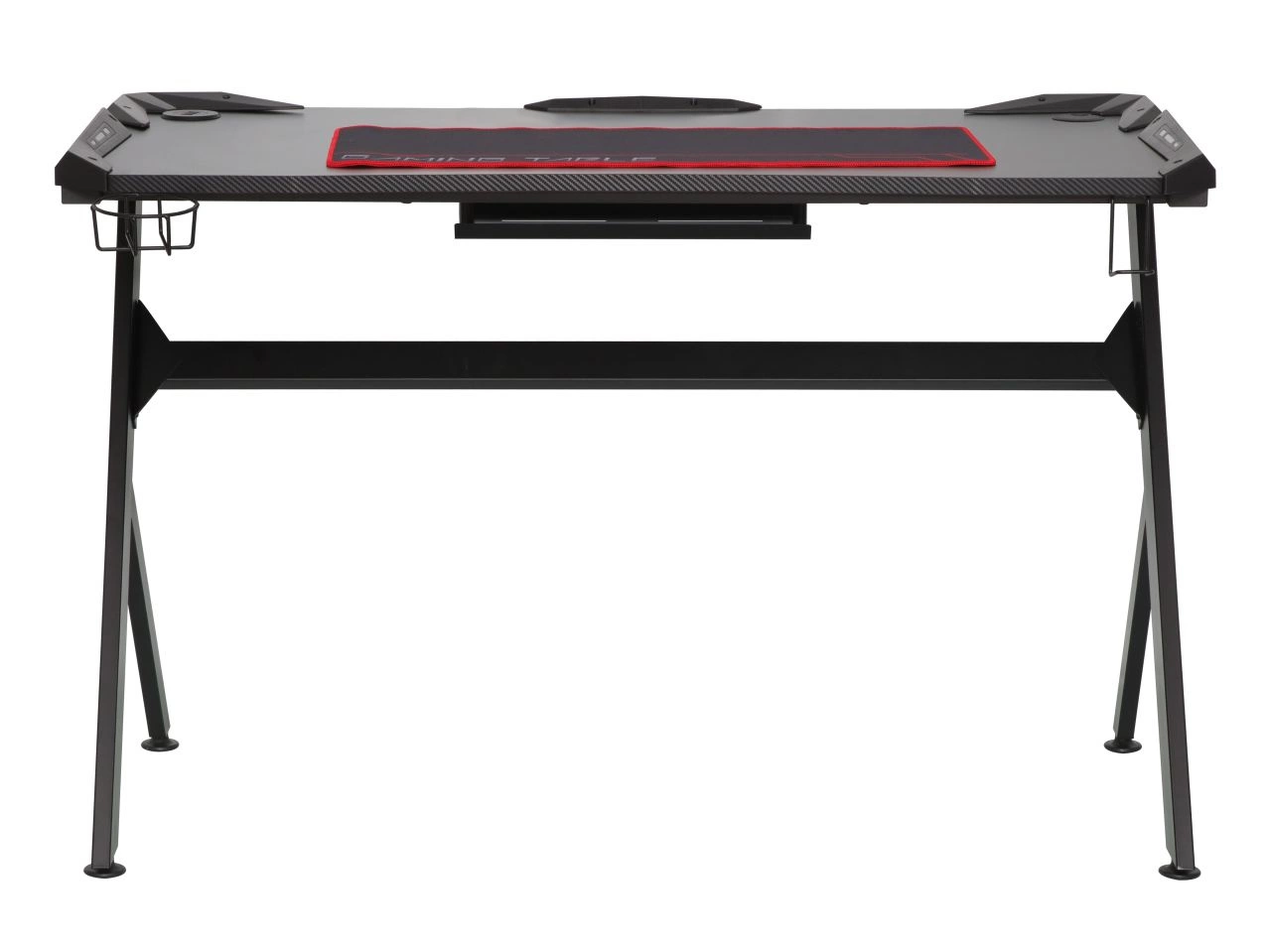 Stůl Jayce je vybaven praktickým držákem na nápoje a speciálním věšákem na sluchátka či příslušenství, takže vše důležité máte vždy po ruce. Pevný kovový rám zaručuje dlouhou životnost a odolnost vůči intenzivnímu používání, zatímco deska s povrchem imitujícím uhlíkové vlákno se snadno udržuje čistá i při častém používání.