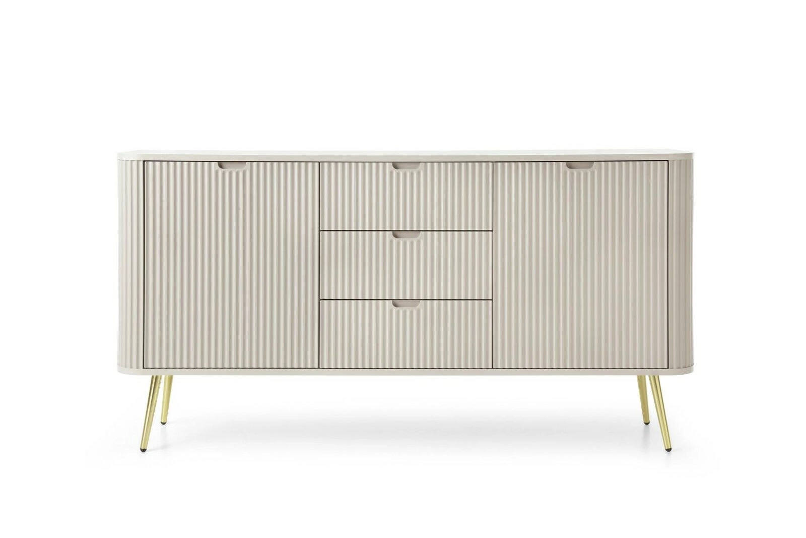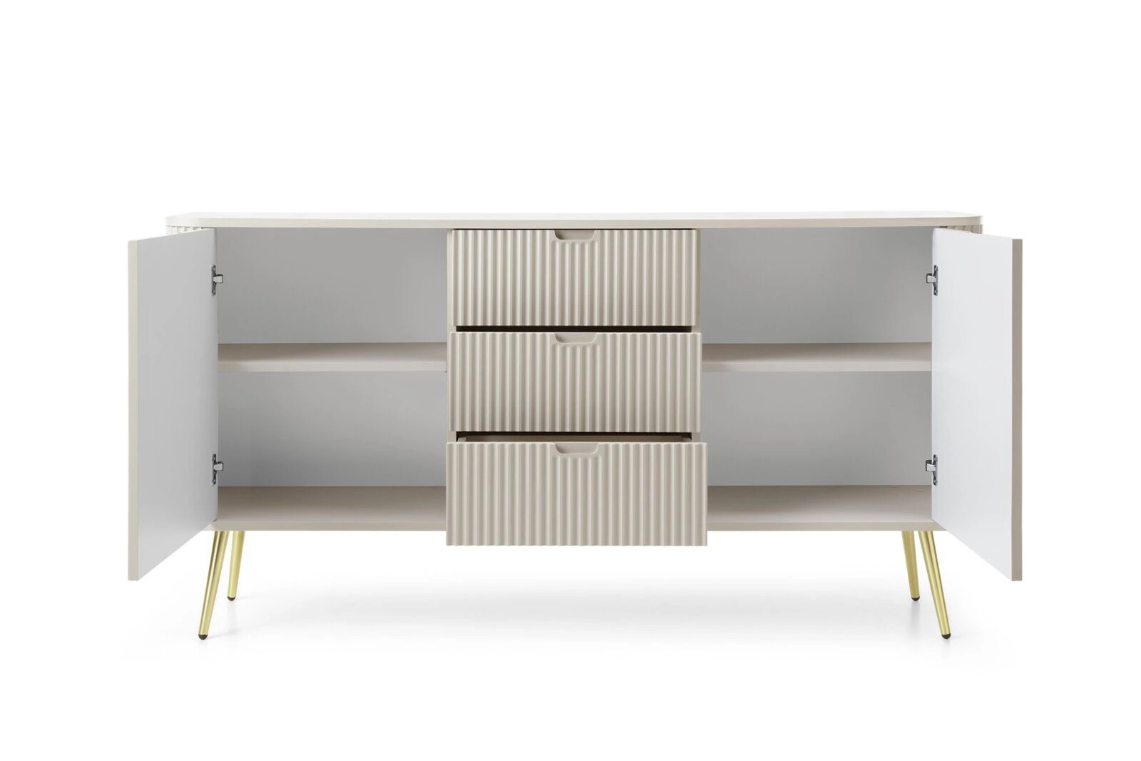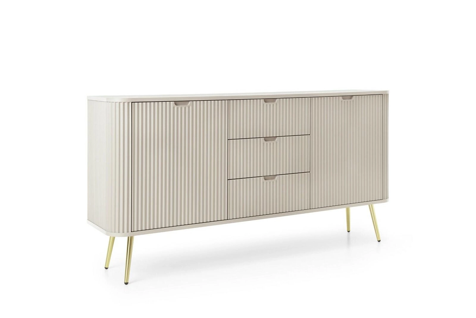 Moderní komoda Seda nadchne vyváženým designem: béžové tělo v polomatném provedení se perfektně doplňuje se zlatými nohami a vytváří stylový prvek v každé místnosti. Drážkované čelní plochy poutají pozornost a vnášejí do prostoru nádech luxusu, který je typický pro glamour styl. Díky šířce 120 cm a hloubce 39 cm je komoda vhodná jak do prostorných, tak menších místností – skvěle poslouží jako designová komoda do obýváku nebo ložnice.