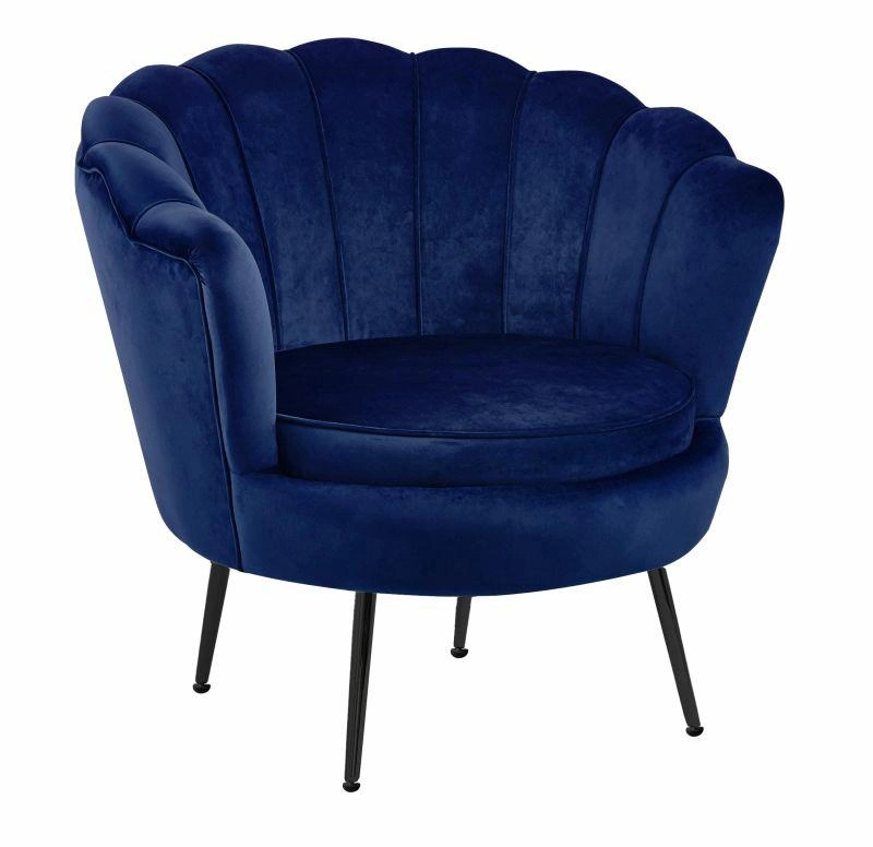 Křeslo Korab VIC v modré barvě s černými nohami jekombinací elegance, pohodlí a glamour stylu, která se bude dokonale hodit do každého moderního interiéru. Jehodesignový tvar inspirovaný tvarem mušle mu dodává jedinečný charakter, který bude ozdobou obývacího pokoje i ložnice.
